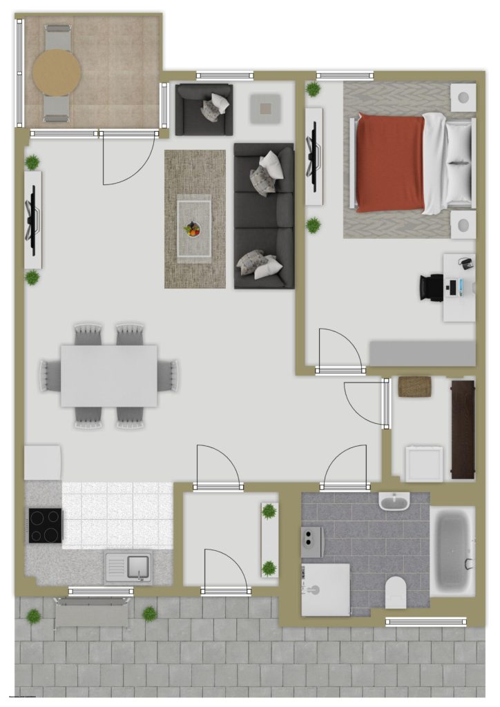 Mit einer Wohnfläche von ca. 69 m² präsentiert sich die Wohnung großzügig und lichtdurchflutet. Der offen gestaltete Wohn-, Ess- und Kochbereich bildet das Herzstück des Zuhauses. Hier verschmelzen Kochen, Genießen und Entspannen zu einem harmonischen Ganzen. Die große Glasfront öffnet den Raum zum überdachten Außenbereich, der bei jedem Wetter zum Verweilen einlädt – ob beim Frühstück im Freien oder bei einem Glas Wein am Abend.