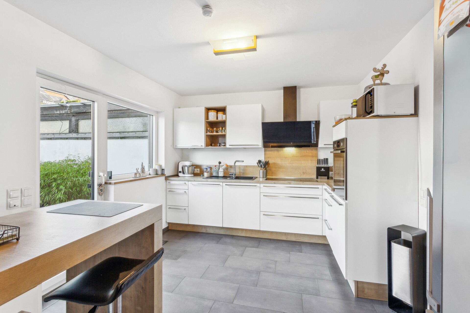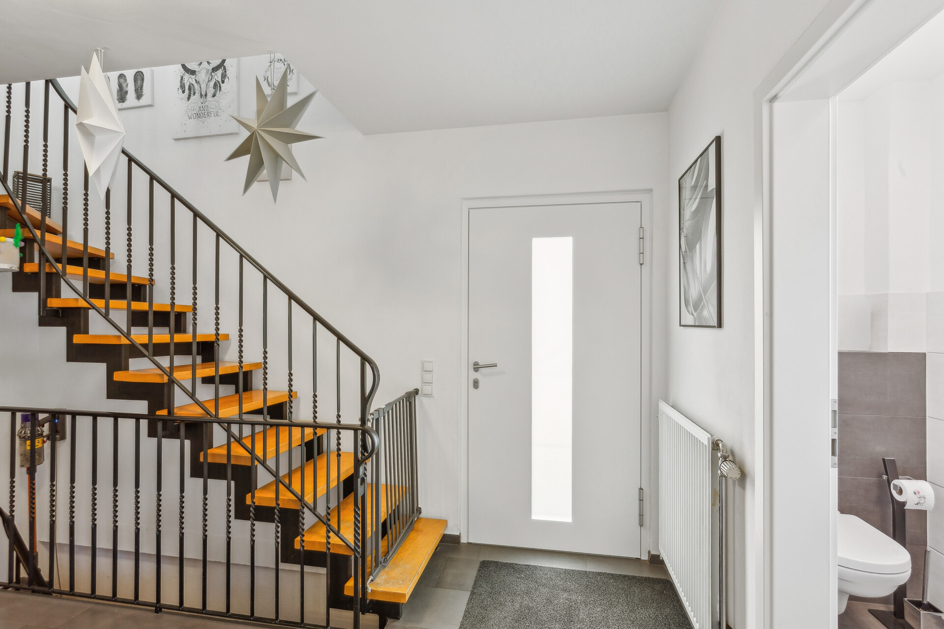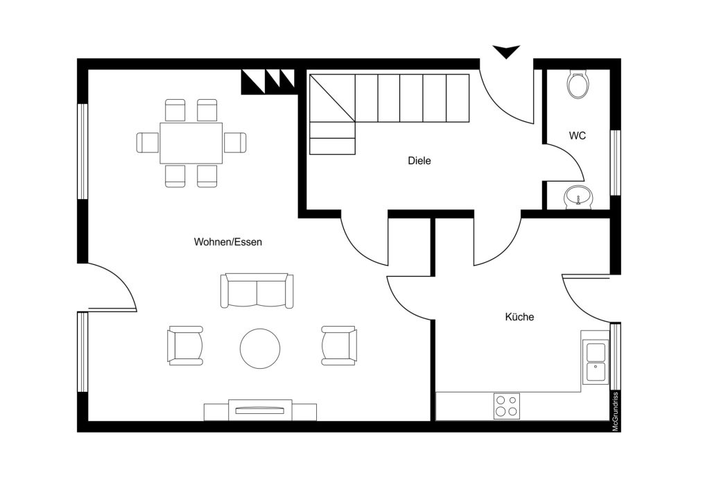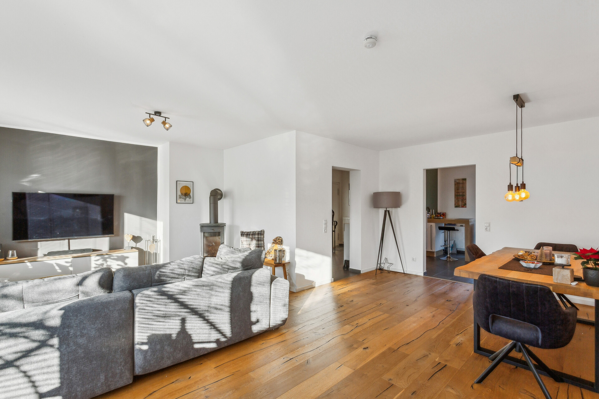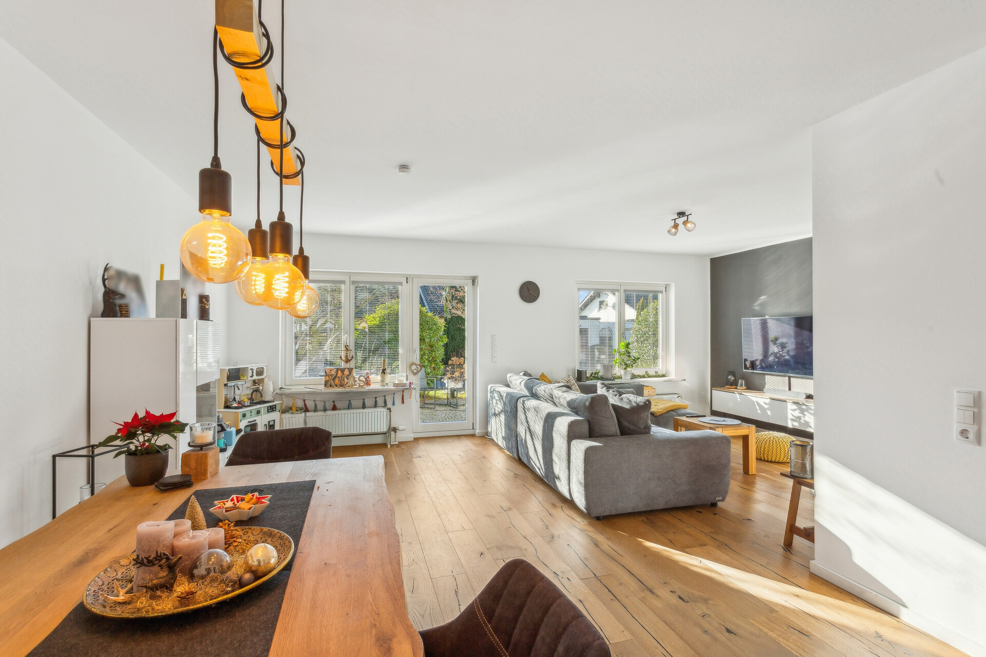 Beim Betreten des Hauses gelangt man in den einladenden Flurbereich, von dem aus alle Räume des Erdgeschosses erreichbar sind. Auf der linken Seite befindet sich ein Gäste-WC mit Tageslichtfenster, während sich geradeaus die Küche öffnet. Die hochwertige Einbauküche aus dem Jahr 2019 ist mit hochwertigen Elektrogeräten der Marken NEFF und Siemens ausgestattet und bietet außerdem direkten Zugang zur Terrasse und in den Garten. Auf der rechten Seite liegt der großzügige Wohn- und Essbereich, der durch einen Kamin und den verlegten Echtholzparkettboden ein gemütliches Wohnambiente schafft.