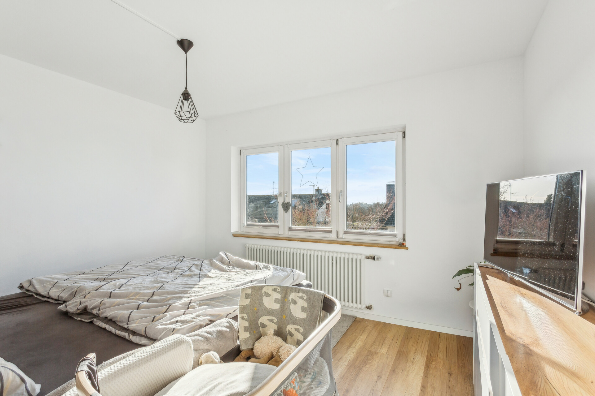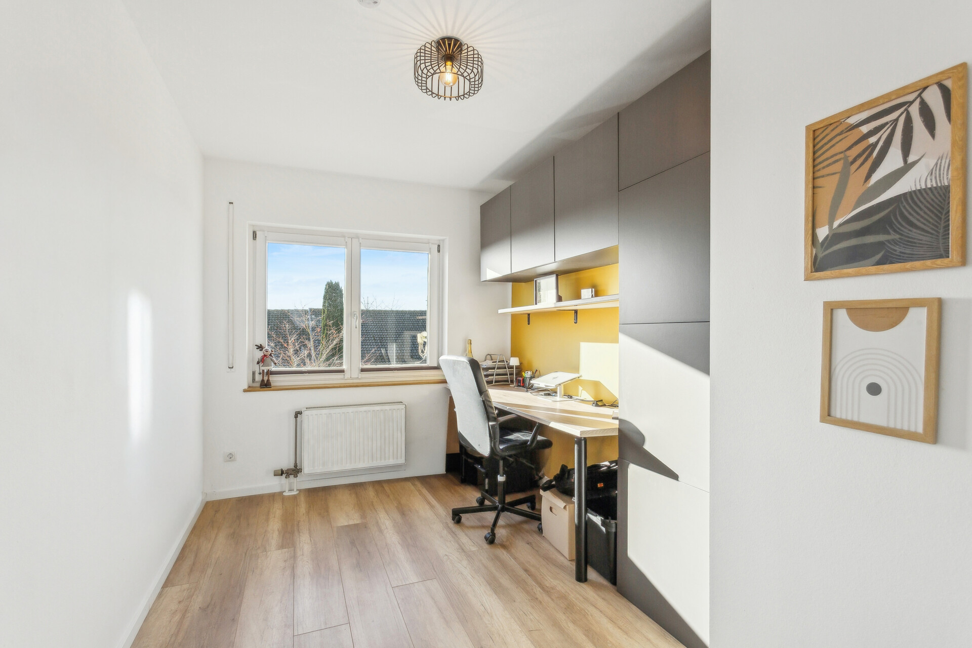 Über die Treppe im Flur gelangt man in das Obergeschoss, das zwei gut geschnittene Schlafzimmer sowie ein weiteres Zimmer umfasst, das aktuell als Büro genutzt wird und sich flexibel als drittes Schlafzimmer eignet. Das modernisierte Tageslichtbad mit Dusche wurde 2023 komplett erneuert, inklusive der Sanitärleitungen.