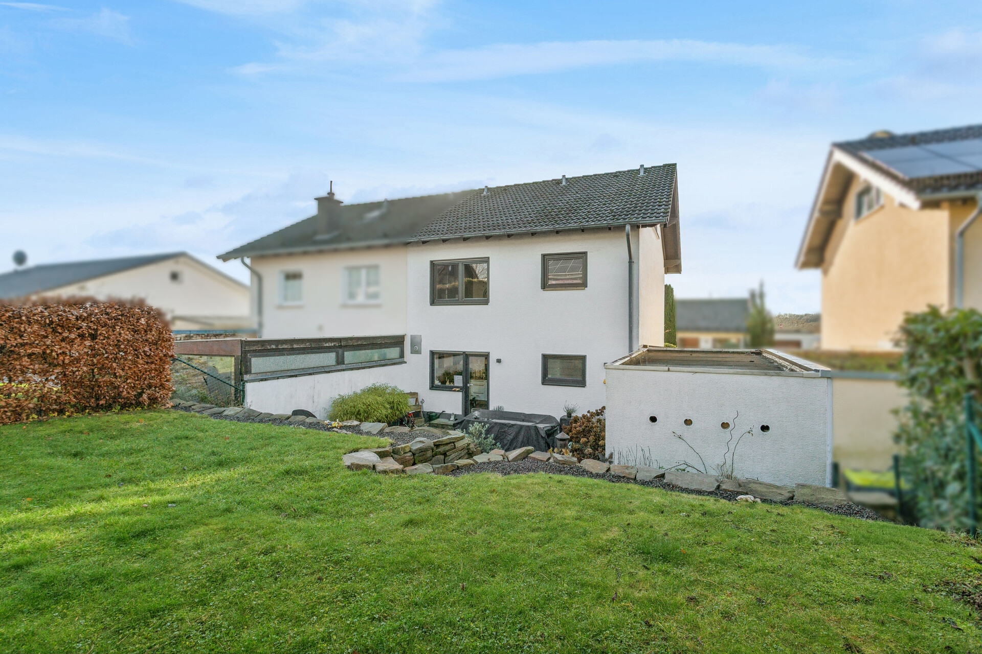 Im Rahmen einer umfassenden Renovierung wurde das gesamte Haus 2019 innen neu verspachtelt, gestrichen und mit neuen Bodenbelägen ausgestattet, sodass ein rundum harmonisches und gepflegtes Wohnbild entsteht. In 2020 wurden außerdem die Außenanlagen erneuert und die Einfahrt neu gepflastert.
