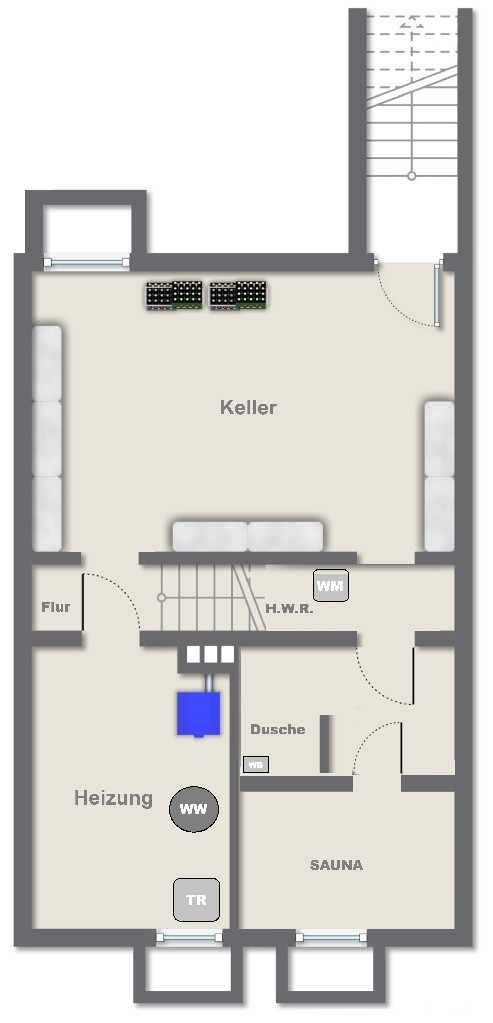 Im Kellergeschoss befinden sich ein Heizungskeller mit Hausanschlüssen, ein großer Kellerraum mit Ausgang zum Garten, zudem unter der Treppe der Anschluss für eine Waschmaschine sowie im weiteren Verlauf eine Sauna mit separater Dusche.