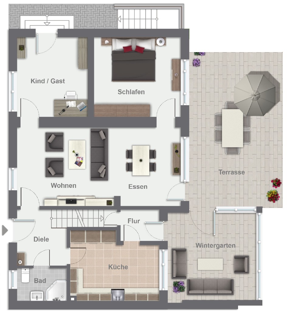 Ca. 27 m² großer Wohn- / Essbereich mit Gartenausgang; zwei Schlafzimmer mit Flächen von ca. 15 m² (Gartenausgang) und ca. 13 m² (Gartenblick); Duschbad, Küche, Wintergarten