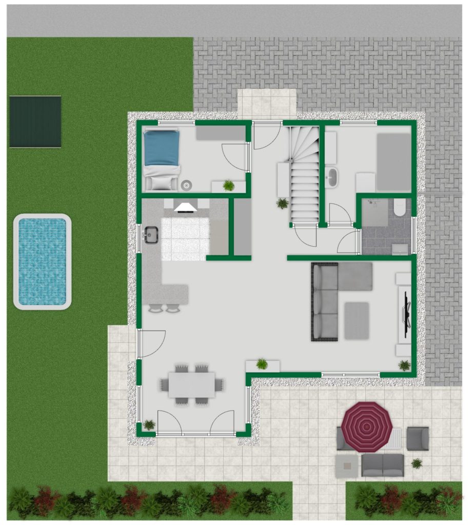 + Hoher Kniestock im Obergeschoss – kaum Einschränkungen durch Dachschrägen