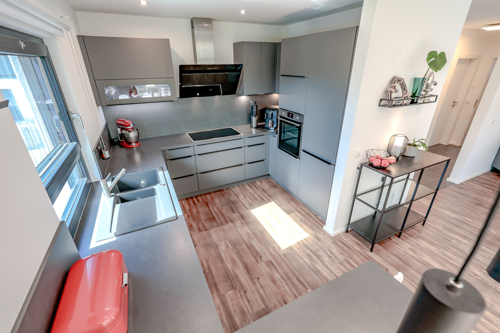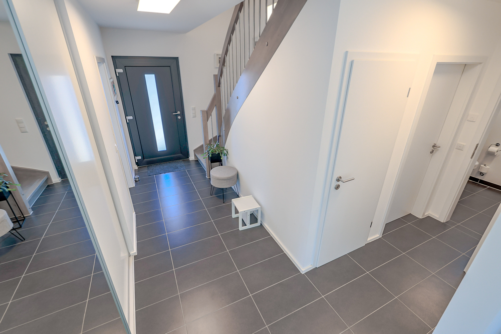Das Erdgeschoss empfängt Sie mit einem hellen und großzügigen Wohn-, Ess- und Kochbereich, der dank großer Fensterflächen und eingelassener Decken-Spots ein offenes, modernes Ambiente schafft. Die stilvolle Einbauküche aus dem Baujahr 2020 ist bereits im Kaufpreis enthalten und überzeugt durch hochwertige Geräte und viel Arbeitsfläche. Ein zusätzliches Zimmer im Erdgeschoss eignet sich perfekt als Schlafzimmer, Büro oder Gästezimmer. Ein modernes Bad mit bodengleicher Dusche, WC, Waschbecken und Fenster, ein praktischer Hausanschlussraum mit Technik, Waschmaschinenanschluss und Waschbecken sowie ein großer Einbauschrank im Eingangsbereich mit Stauraum unter der Treppe ergänzen diese Etage.
