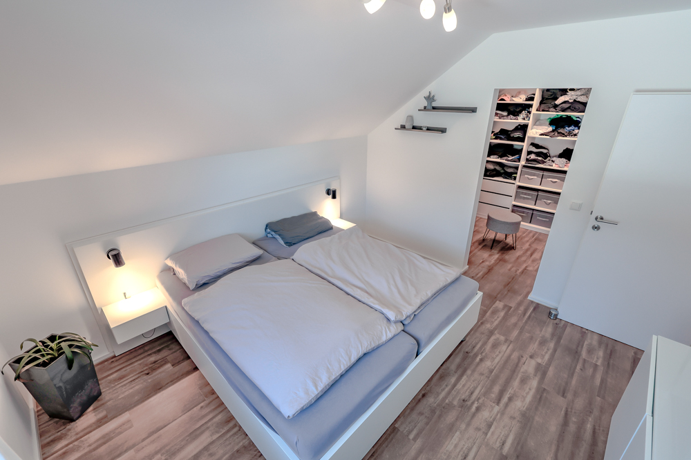 Im Obergeschoss erwarten Sie ein geräumiger Flur, ein riesiges Familienbad mit bodengleicher Dusche, Badewanne, Doppelwaschtisch, WC und Fenster sowie insgesamt drei Schlafzimmer. Das Elternschlafzimmer verfügt über einen angrenzenden, begehbaren Kleiderschrank mit maßgefertigtem Schranksystem, das im Preis inbegriffen ist. Dank des hohen Kniestocks sind die Dachschrägen kaum spürbar und bieten eine angenehme Raumhöhe. Zusätzlich sorgt ein Dachboden für weitere Staufläche.