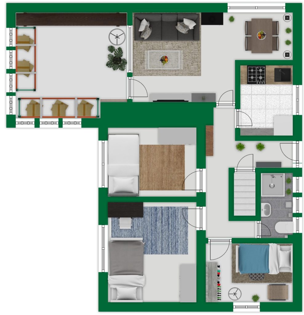 Über eine Treppe von der Einfahrt gelangt man in das eigentliche Wohngeschoss. Hier befinden sich eine Küche mit moderner Einbauküche, ein Badezimmer (mit Fenster, Dusche, WC und Waschtisch), ein Wintergarten sowie drei weitere Zimmer, die flexibel als Schlafzimmer, Arbeitszimmer oder Wohnzimmer genutzt werden können.