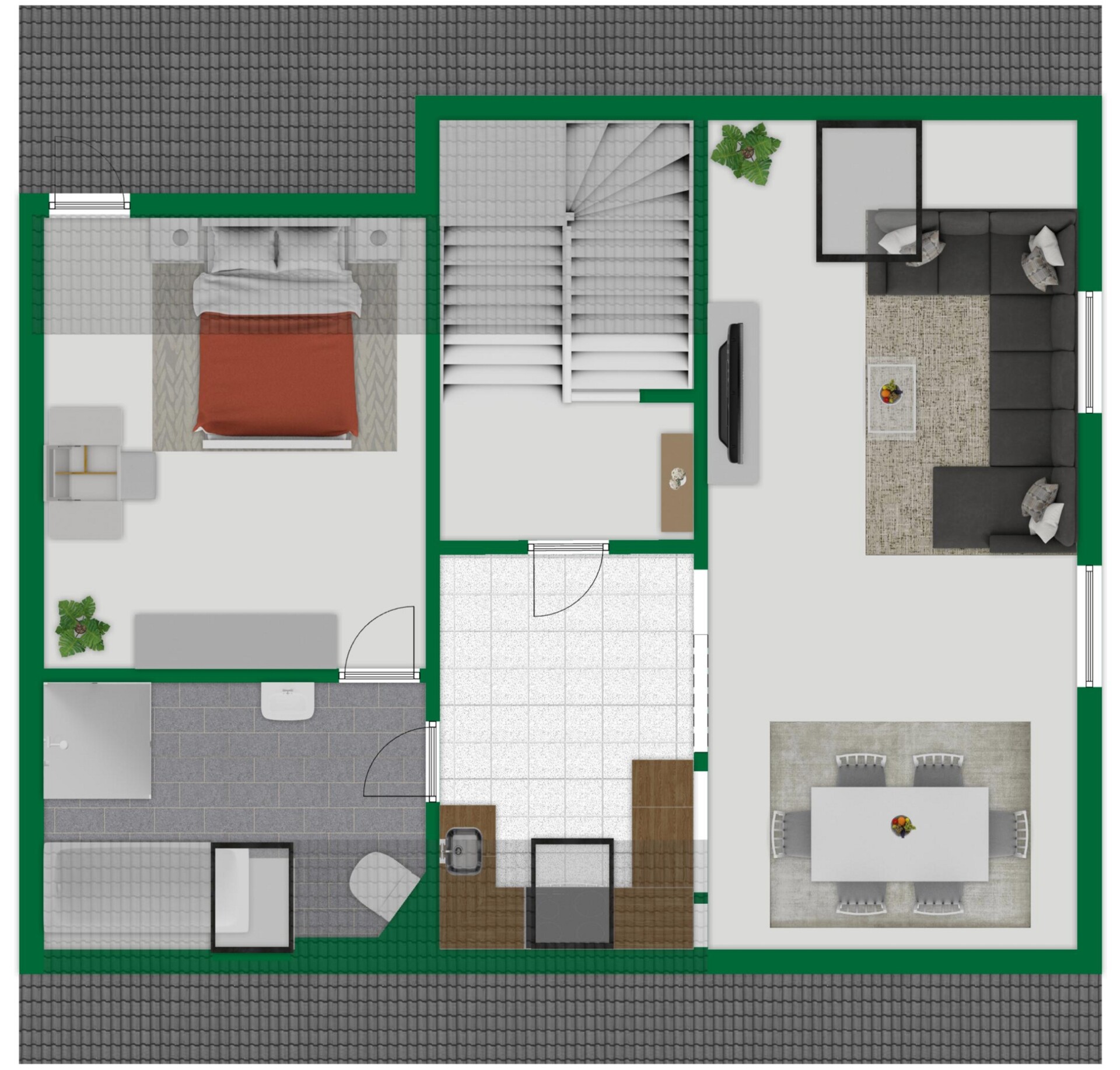 Die erste Einheit im Erdgeschoss ist eine charmante 2-Zimmer-Wohnung. Sie verfügt über einen Wohn- und Essbereich mit offener Küche sowie ein Schlafzimmer. Die Küche wurde frisch mit modernen Bodenfliesen ausgestattet.