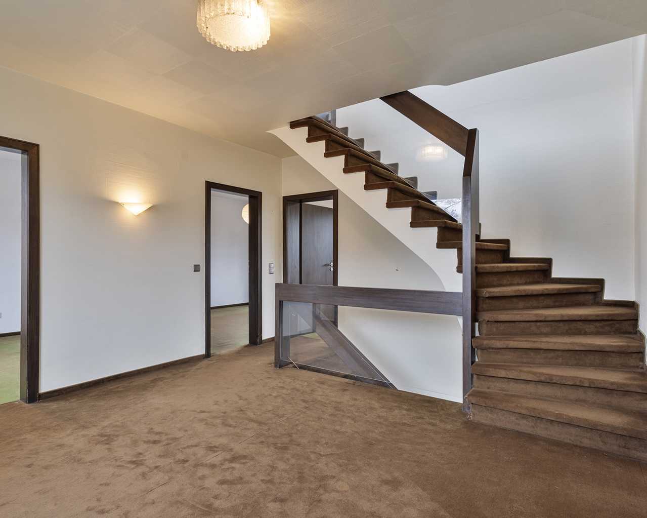 Der Grundriss ist mit großen Dielenflächen hell und offen gestaltet, sodass ein großzügiges Raumgefühl entsteht. Alle Etagen sind über eine breite Treppe verbunden. Das hochwertige Holzgeländer in Kombination mit Plexiglas gibt ein modernes und wertiges Ambiente. Der für Treppenstufen und Bodenbeläge hochwertige Teppichboden in warmem Braunton unterstreicht das harmonische und ansprechende Wohngefühl.