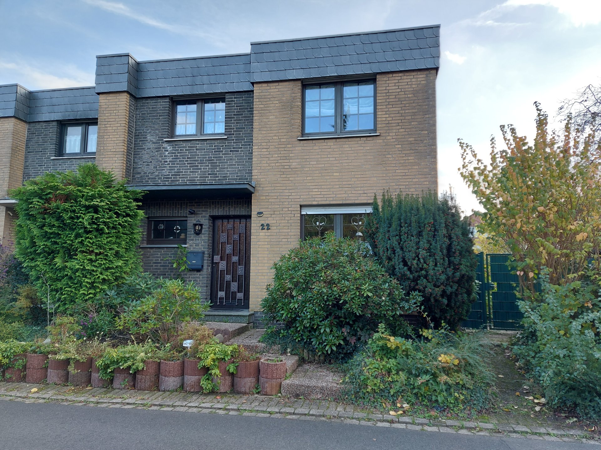 – Massivbauweise mit gelber und grauer Klinkerfassade, Schiefer im oberen Fassadenbereich.