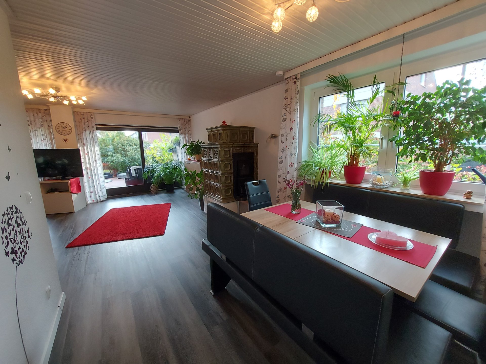 – Großes Wohnzimmer mit Schiebetür zur Terrasse und Kachelofen