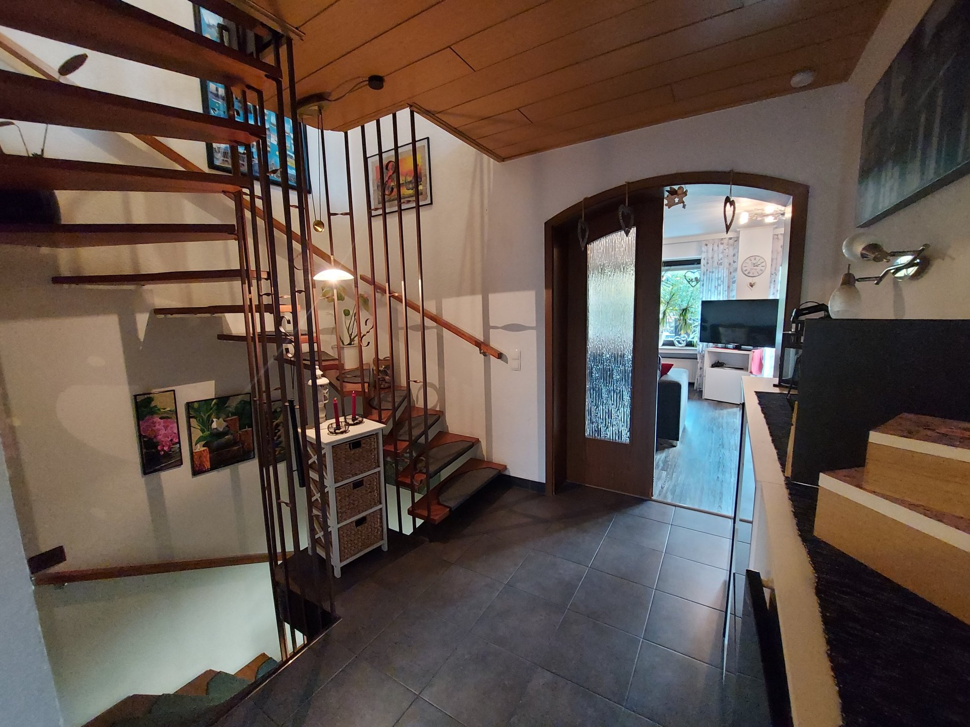 Im Erdgeschoss empfängt Sie ein einladender Eingangsbereich, der mit Fliesenboden, einem praktischen Einbauschrank, weiß lackierten Wandpaneelen und einer stilvollen dunklen Holzdecke gestaltet ist. Das helle Gäste-WC profitiert von natürlichem Tageslicht. Die moderne Küche, die sich in unmittelbarer Nähe zum Wohnbereich befindet, ist funktional und einladend. Das lichtdurchflutete Wohnzimmer, ausgestattet mit einer großen Glasfront zur Terrasse und grauem Vinylboden, verfügt über einen gemütlichen Kachelofen, der für eine angenehme Atmosphäre sorgt.