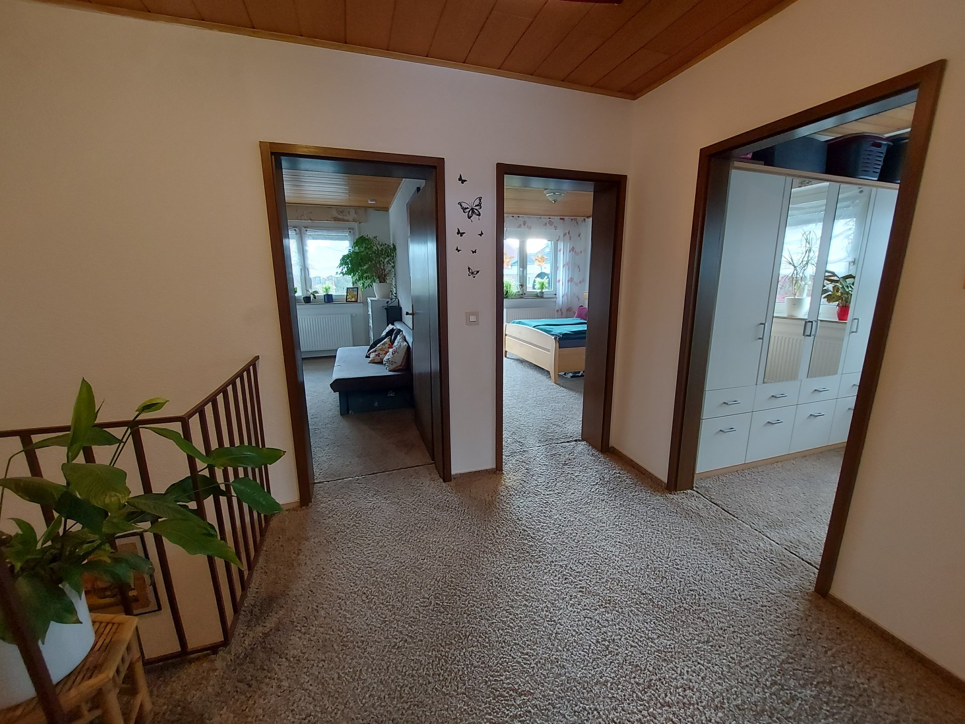 Im Obergeschoss setzt sich das harmonische Gestaltungskonzept mit Holzelementen fort. Alle Wohnräume sind mit Teppichböden ausgelegt. Das Badezimmer ist funktional gestaltet und bietet eine Badewanne, Dusche, WC, Waschbecken, ein Fenster und Spotbeleuchtung. Vom Elternschlafzimmer hat man Zugang zum Balkon. Es gibt drei weitere Schlafzimmer und ein Ankleidezimmer im Dachgeschoss.