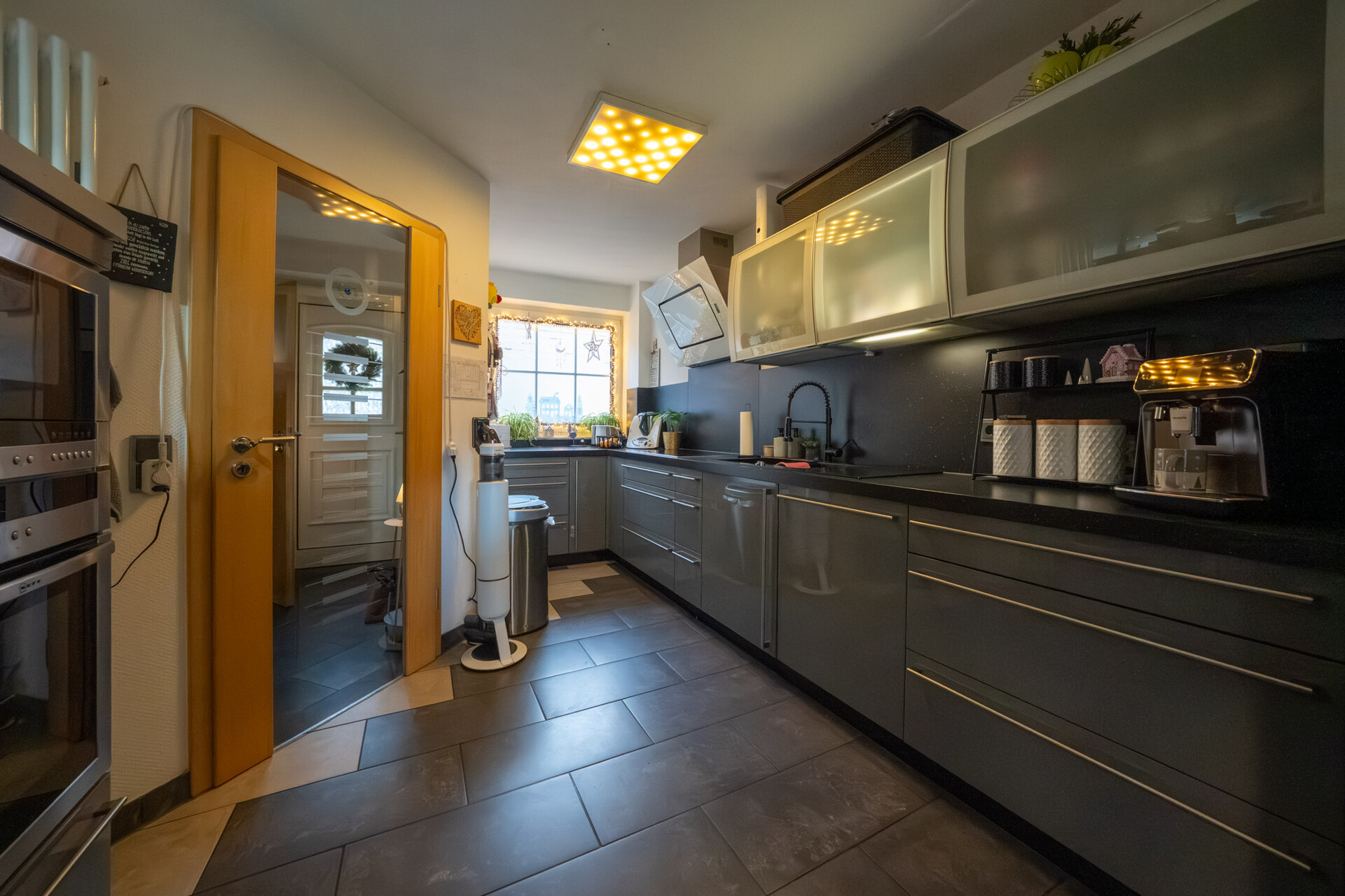 Bereits beim Eintritt setzt das Haus ein Statement: edler schwarzer Granit in Diele und Treppe verleiht eine elegante, zeitlose Atmosphäre. Der lichtdurchflutete Wohn- und Essbereich überzeugt mit Offenheit und Wärme – nicht zuletzt dank des gemütlichen Kaminofens, der für stimmungsvolle Abende das ganze Jahr über sorgt. Die moderne Küche integriert sich harmonisch und bietet viel Platz für Kochen, Genuss und gemeinsame Momente.