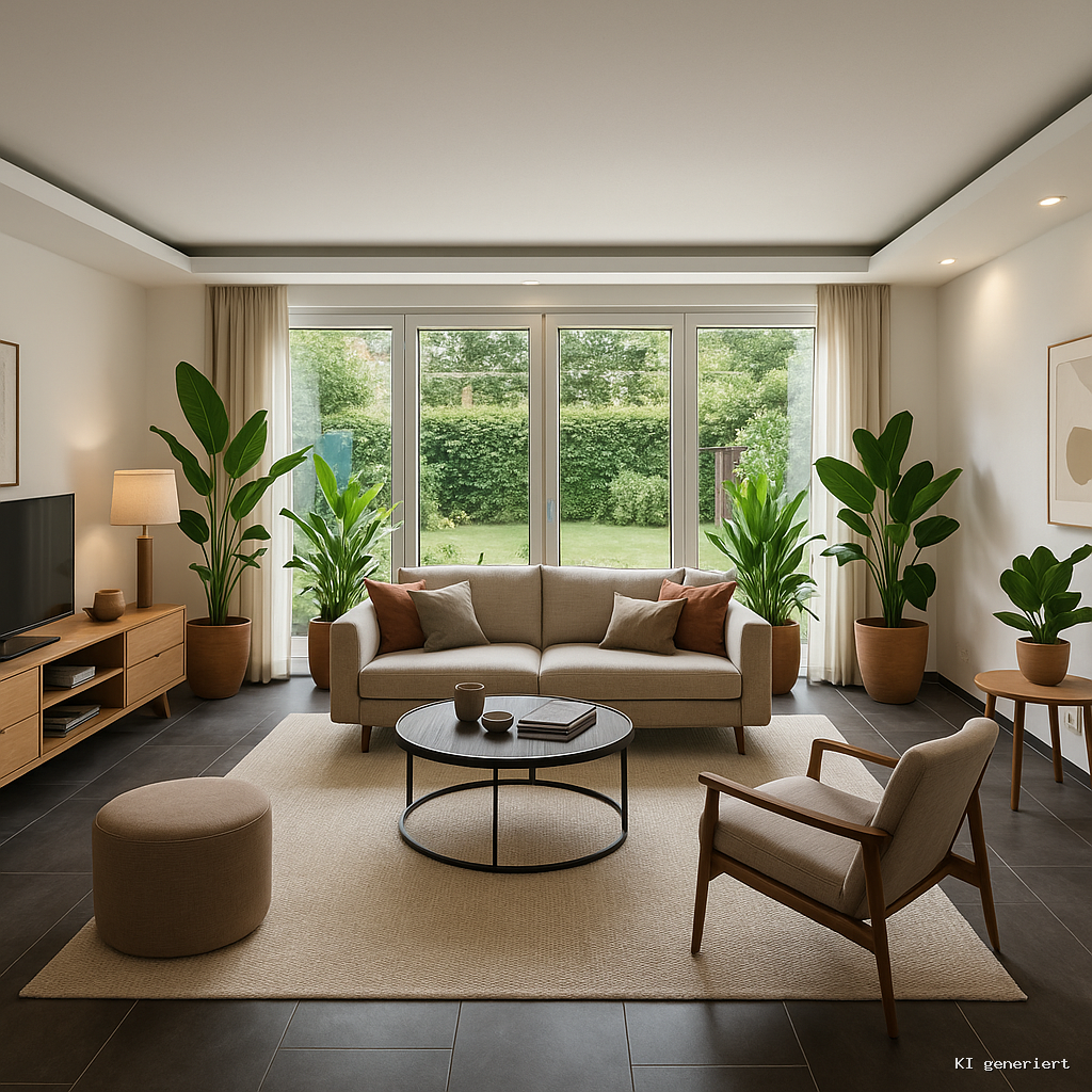– Wohnzimmer mit großer Glasfront und Zugang zur Terrasse