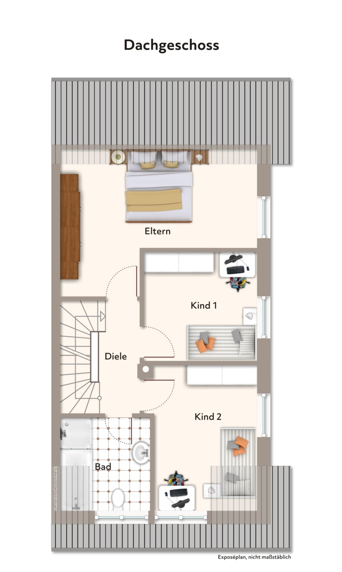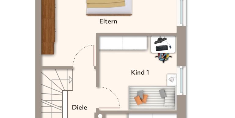 – Spitzboden: ausgebaut, heller Laminatboden, Heizkörper vorhanden