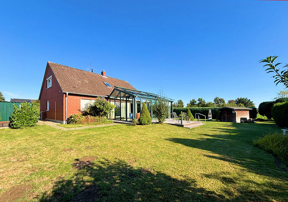 Das Haus verfügt über eine Gesamtwohnfläche von ca. 182 m² und bietet damit ausreichend Platz für Familien oder Paare mit Platzbedarf. Rechts neben dem Haus befinden sich zwei Garagen, während links ein genehmigter Stellplatz für einen Wohnwagen angelegt ist.
