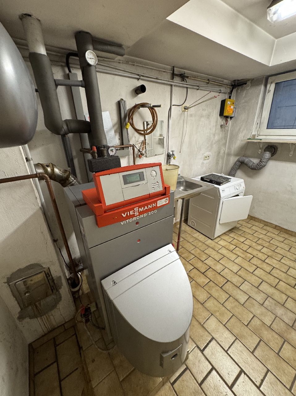 Die Beheizung erfolgt über eine erneuerte Viessmann Öl-Heizung. Der Tank befindet sich im Erdreich vor der Garage. Die seitlich im Bauwich befindliche Garage hat ein Alu- Sektionaltor und Motorantrieb. Die Kunststofffenster haben eine Isolierverglasung. Das rückwärtige bodentiefe Fenster- / Türelement im EG ist mit motorbetriebenen Kunststoffrollläden und Beschattungsmarkise ausgestattet. Das Gäste WC-Fenster hat eine Außenvergitterung. Die Hauseingangstür ist mit einem Sicherheitsriegel versehen. Innentreppe in Stahlkonstruktion mit Massivholzstufen. Die Treppe verfügt zusätzlich über einen Treppenlift um sich ggfs. barrierefrei bewegen zu können. Der Wohnraum ist mit Mosaikholzparkett verlegt. Eine Glastür trennt Wohnraum mit dem Flur.