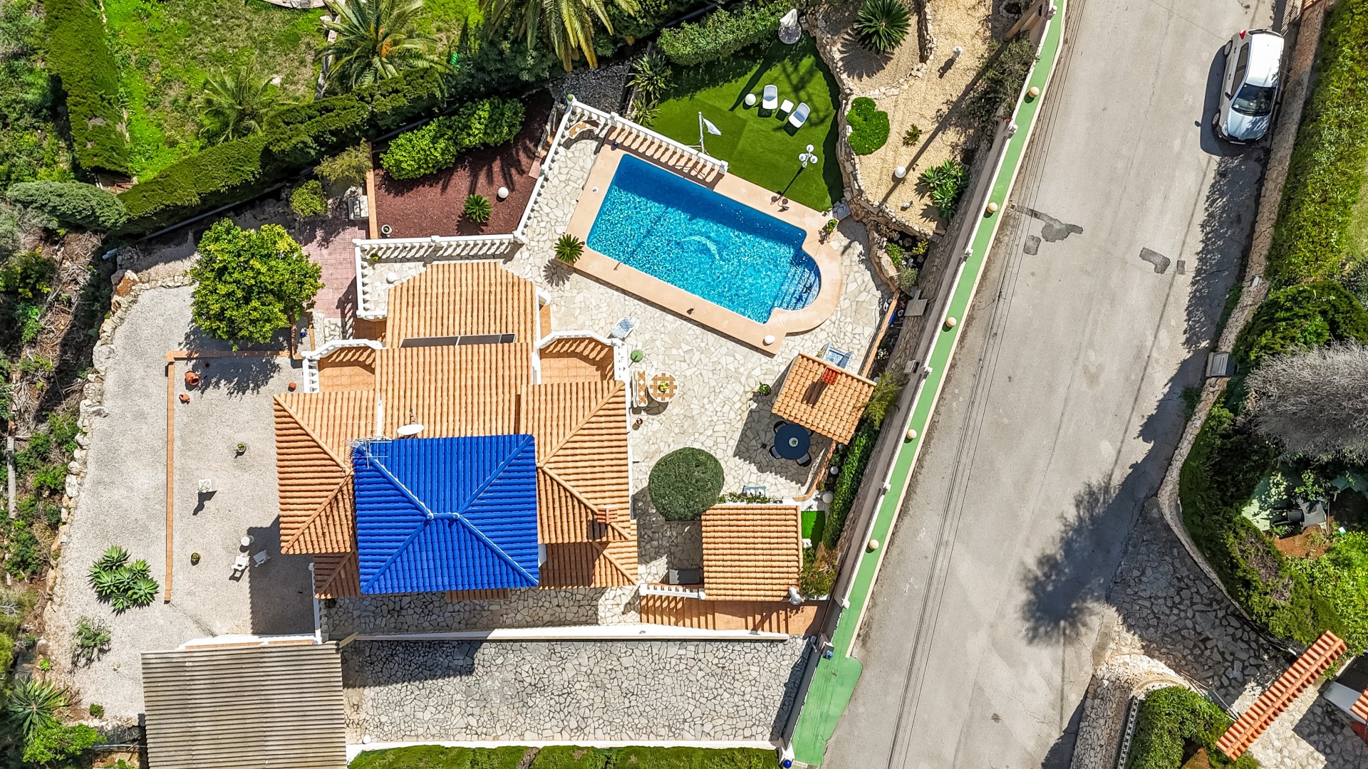 Die Außenanlagen sind pflegeleicht angelegt und bieten eine großzügige mit Naturstein belegte Freiterrasse mit Sommerküche, Technikraum, Pool von 8m x4 m mit römischer Treppe (in 2026 neu gefliest), Außen-Dusche mit Warmwasser, mit Naturstein belegte Zufahrt mit anschließendem Carport und eine ansprechende mediterrane Bepflanzung.