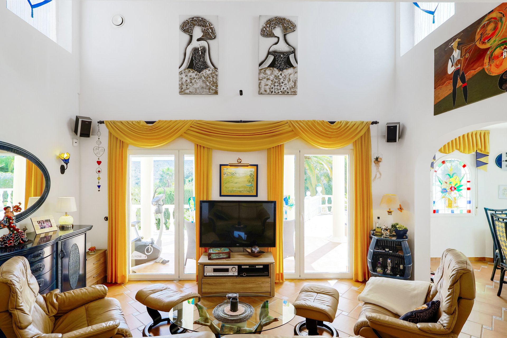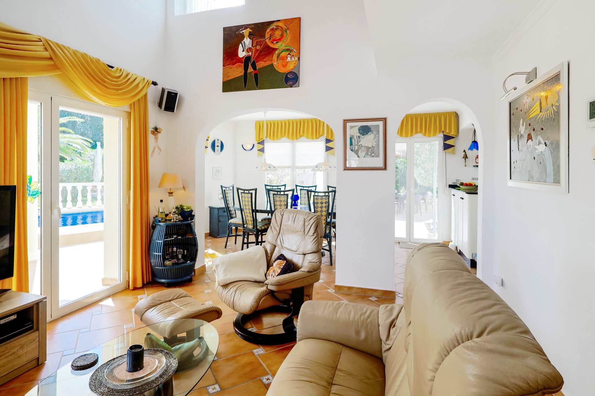 Über den Eingangsbereich mit Gästetoilette, Garderobe und Treppenaufgang zum Obergeschoss betreten wir das Wohnzimmer mit doppelter Deckenhöhe und Zugang zu einer überdachten Terrasse mit anschließender Poolterrasse. Rechter Hand schließt das Esszimmer mit amerikanischer Küche und Zugang zu der Poolterrasse an. Linker Hand befindet sich ein kleiner Verteiler zu einem Gästezimmer und dem Hauptschlafzimmer mit Duschbad en Suite.