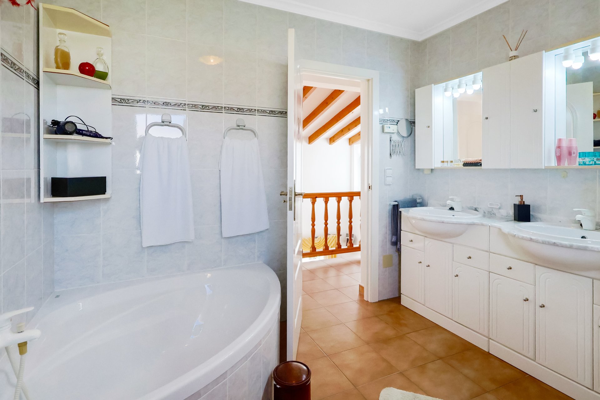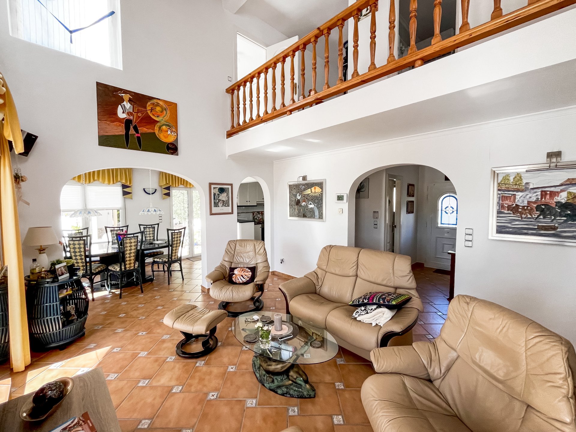 Im Obergeschoss befinden sich ein geräumiges Bad mit Eckbadewanne, Dusche und Doppelwaschbecken sowie zwei Gästezimmer, verbunden über eine Galerie mit Blick aufs Wohnzimmer und jeweils einem privaten zum Südosten ausgerichteten Balkon. Im Untergeschoss befindet sich ein von außen begehbarer Kellerraum von ca. 20 Qm.