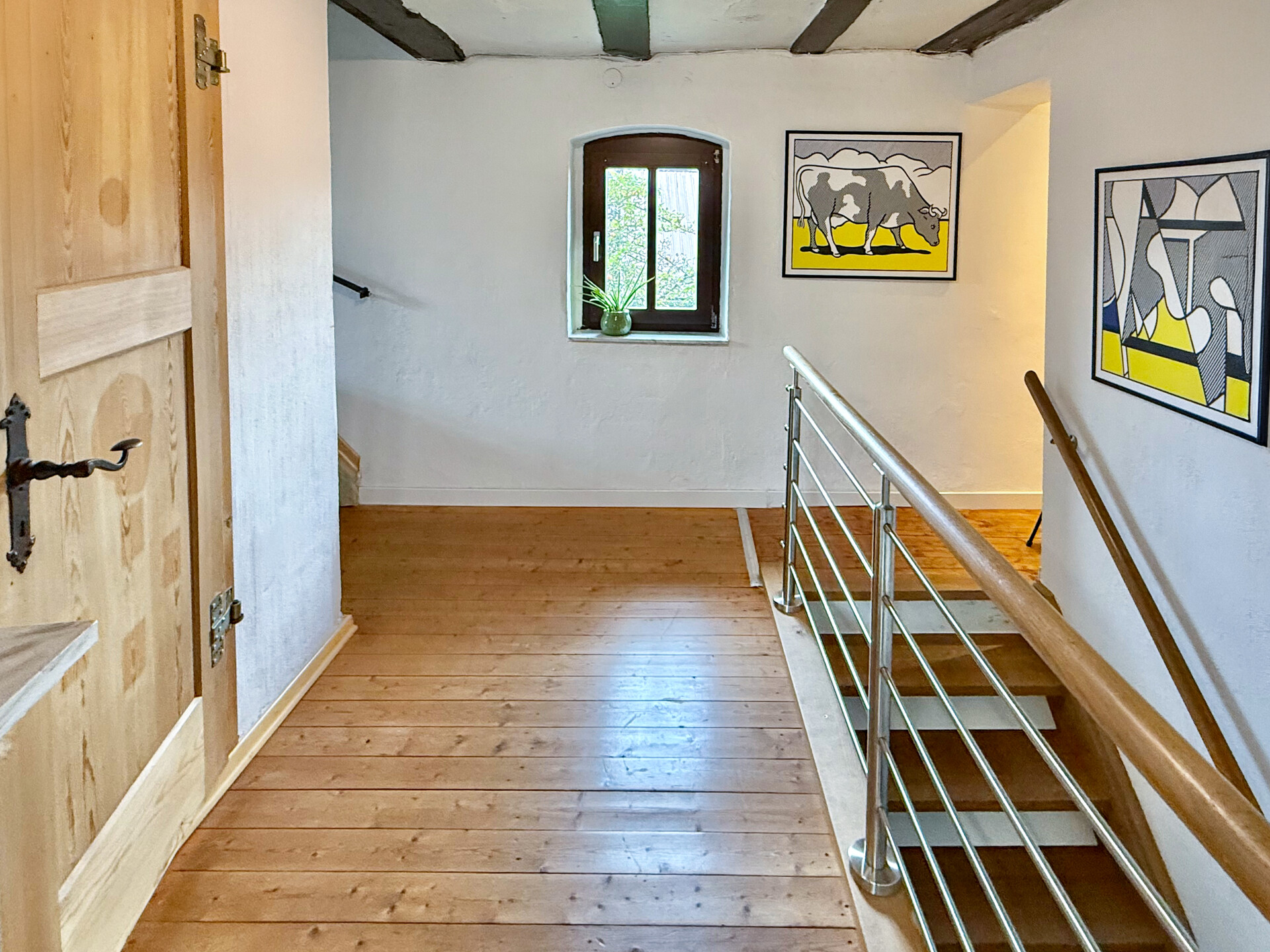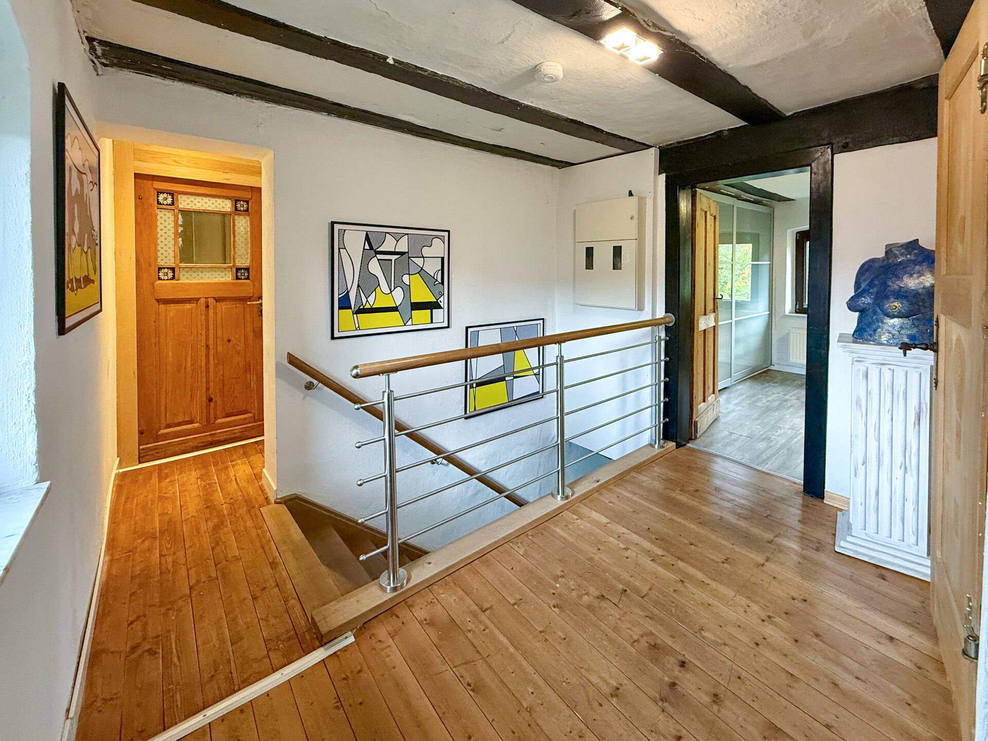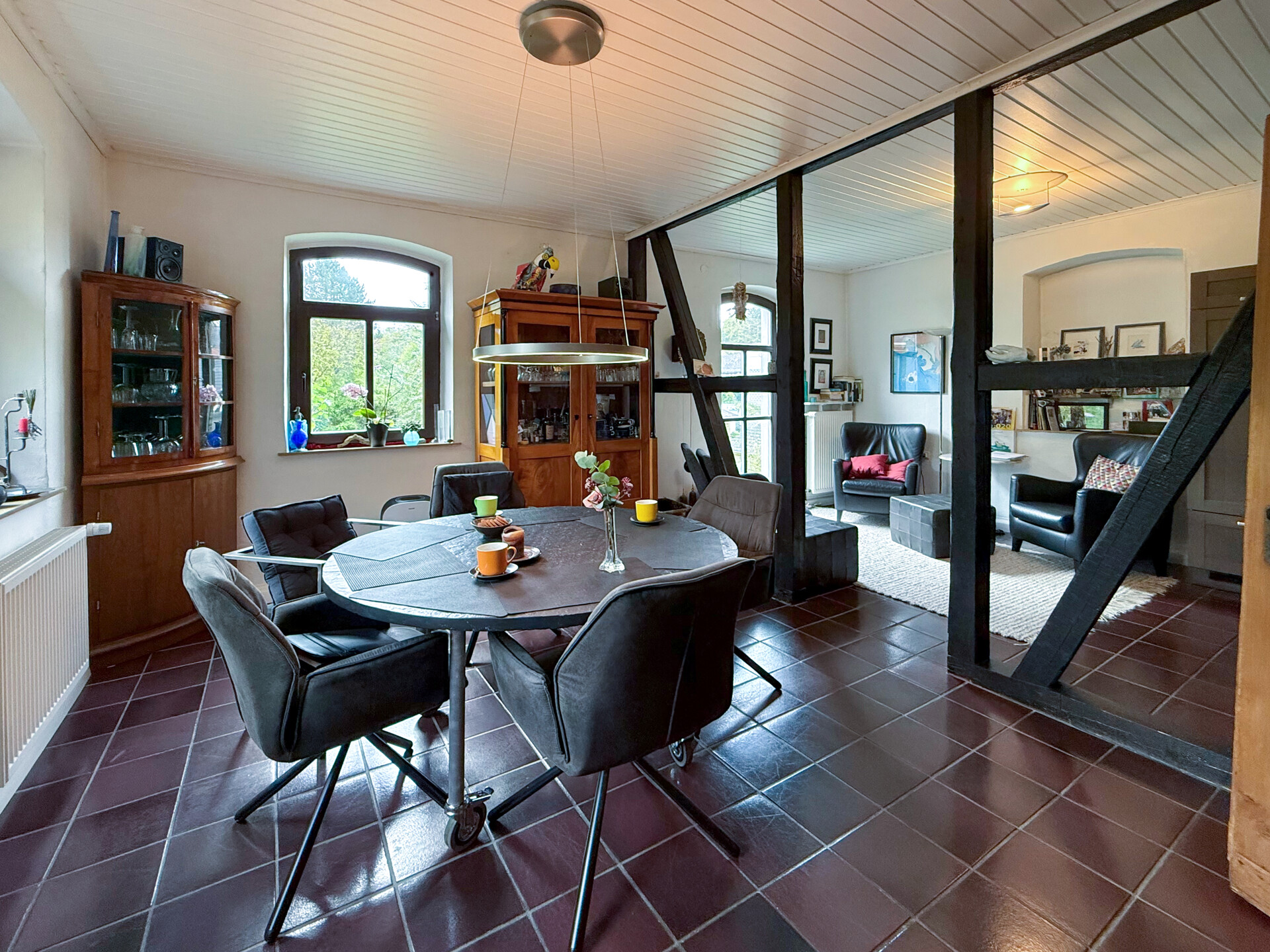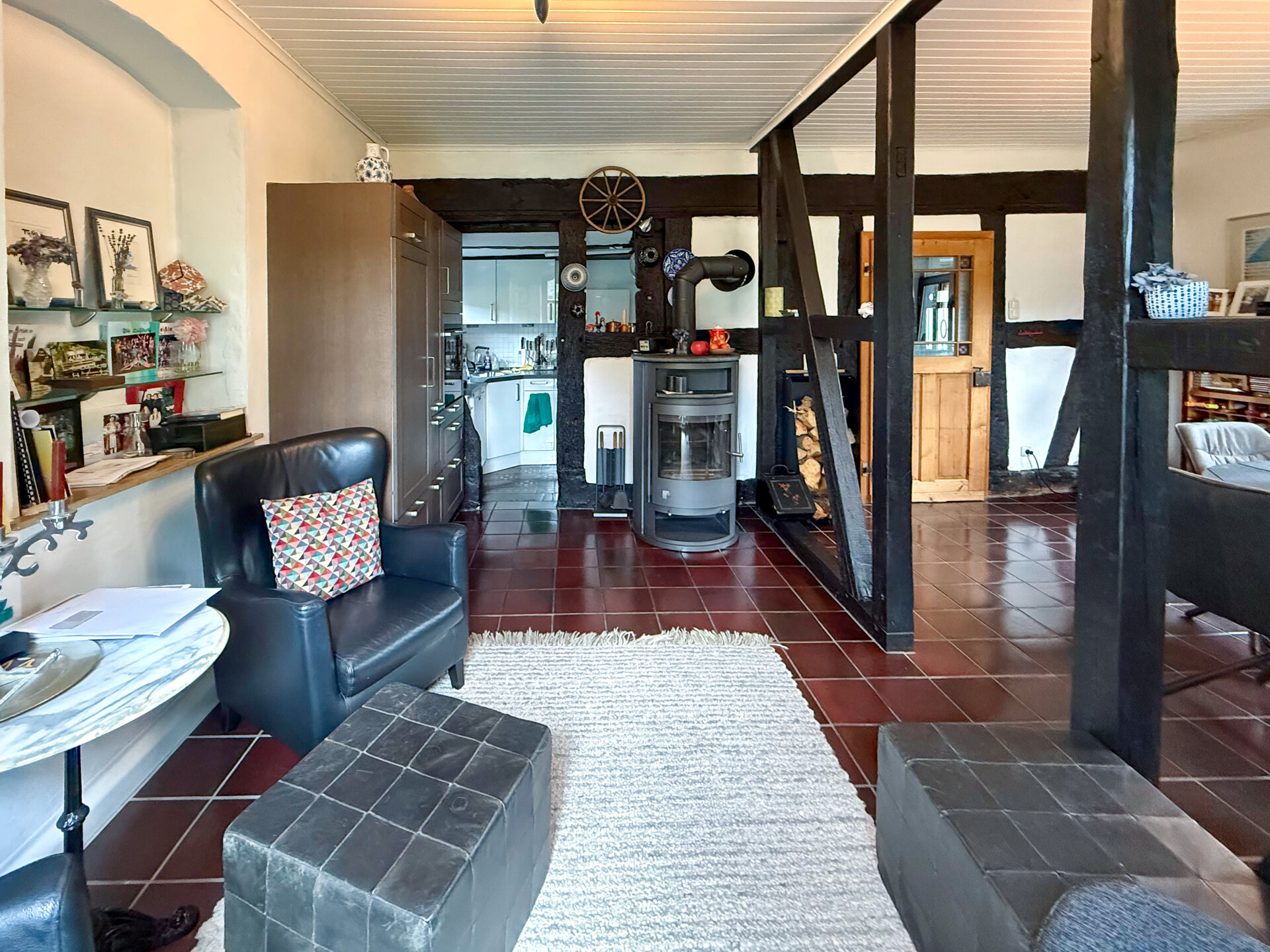 Dieses liebevoll modernisierte, ehemalige Fachwerkhaus mit Ursprung um 1800 vereint historischen Charme mit modernstem Wohnkomfort. Auf einem Grundstück von rd. 1.403 m² präsentiert sich das Anwesen – nach stetigen Sanierungen und Renovierungen von 1981 bis heute – in einem sehr guten Zustand! Im Erdgeschoss ist das Wohnen nahezu altersgerecht möglich: Neben dem gemütlichen Wohn-/Essbereich stehen eine hochwertig ausgestattete Küche, ein Wannenbad sowie ein Schlafzimmer oder Büro zur Verfügung. Im ersten Obergeschoss erwarten Sie ein eindrucksvolles Schlafzimmer mit Galerie, ein Kinderzimmer oder eine Ankleide, ein sep. WC sowie ein Wellness-/Saunaraum – perfekt für entspannte Stunden. Ein weiteres Zimmer befindet sich im Dachgeschoss. Insgesamt verfügt das Haupthaus über rd. 174 m² Wohnfläche. Ergänzt wird das Angebot durch vielfältige Nebennutzungen: Im Erdgeschoss der Scheune befinden sich Werkstatt, Heizung/Waschküche und ein Nebenraum, im Obergeschoss ein großzügiger Hobbyraum. Drei Kellerräume bieten zusätzlichen Stauraum. Zum Anwesen gehören außerdem ein Doppelcarport mit Wallbox und Abstellraum, ein Pavillon sowie das wunderschön angelegte Gartengrundstück – ein echtes Refugium, für alle, die Qualität und Gemütlichkeit schätzen!