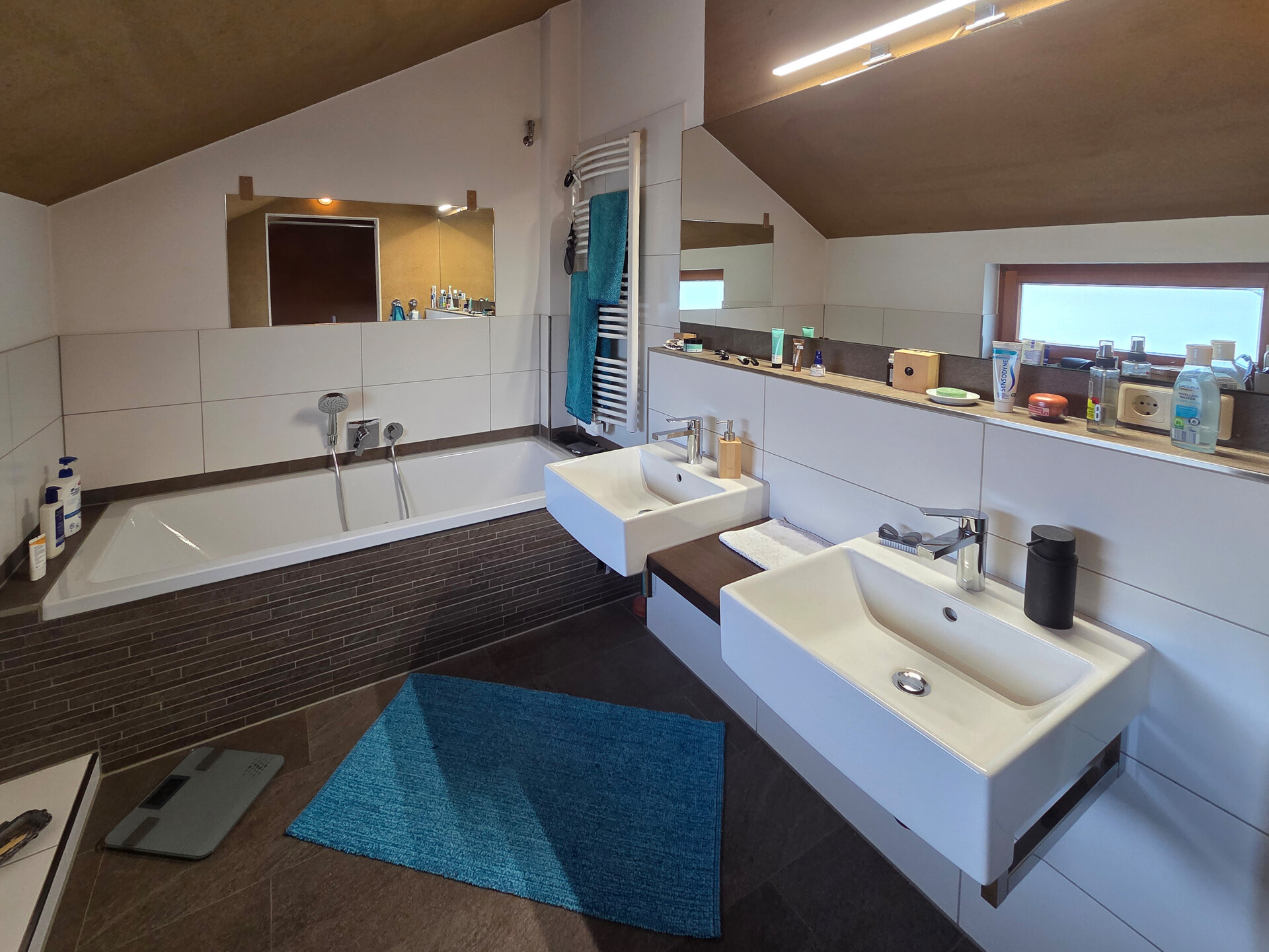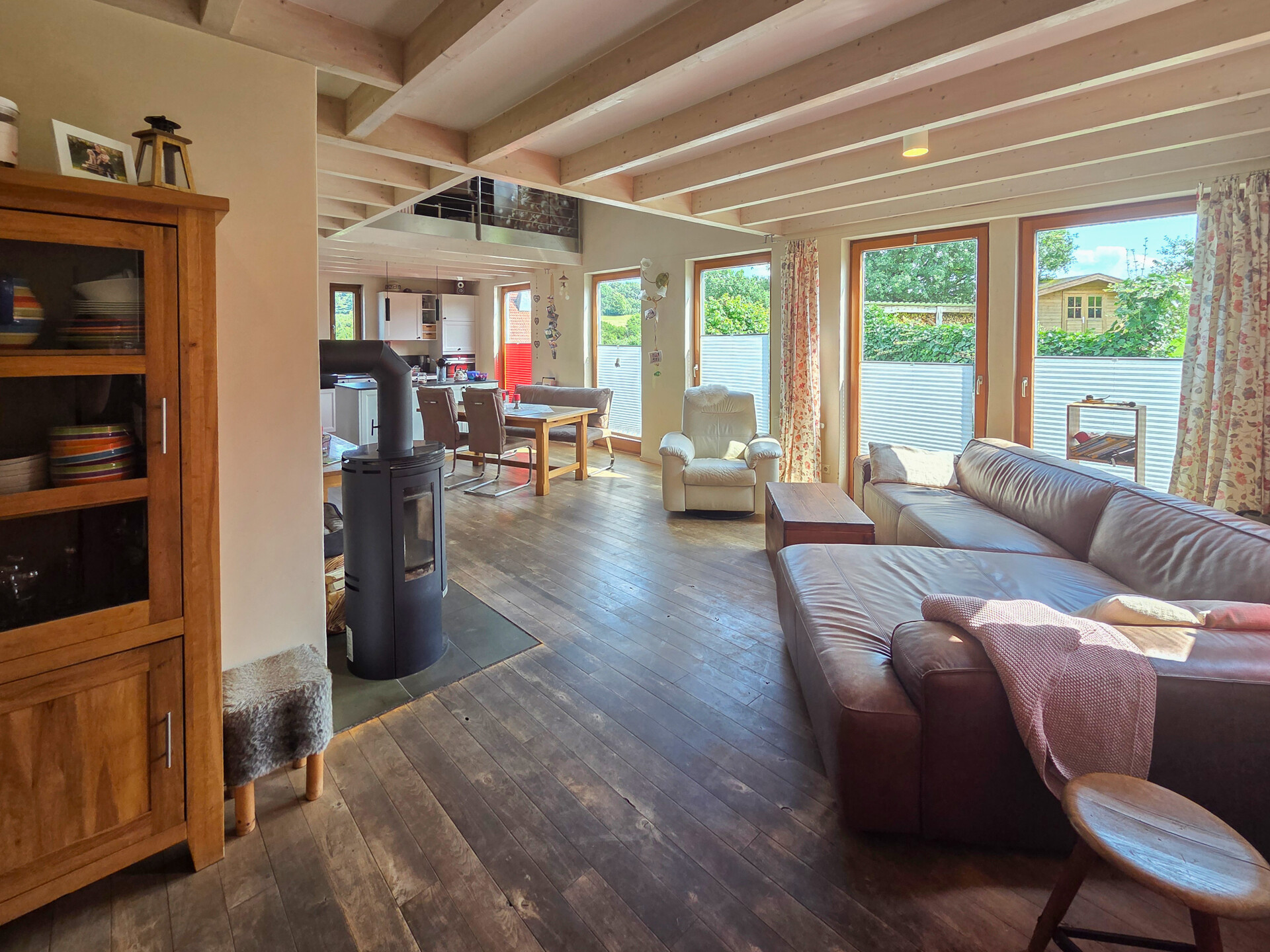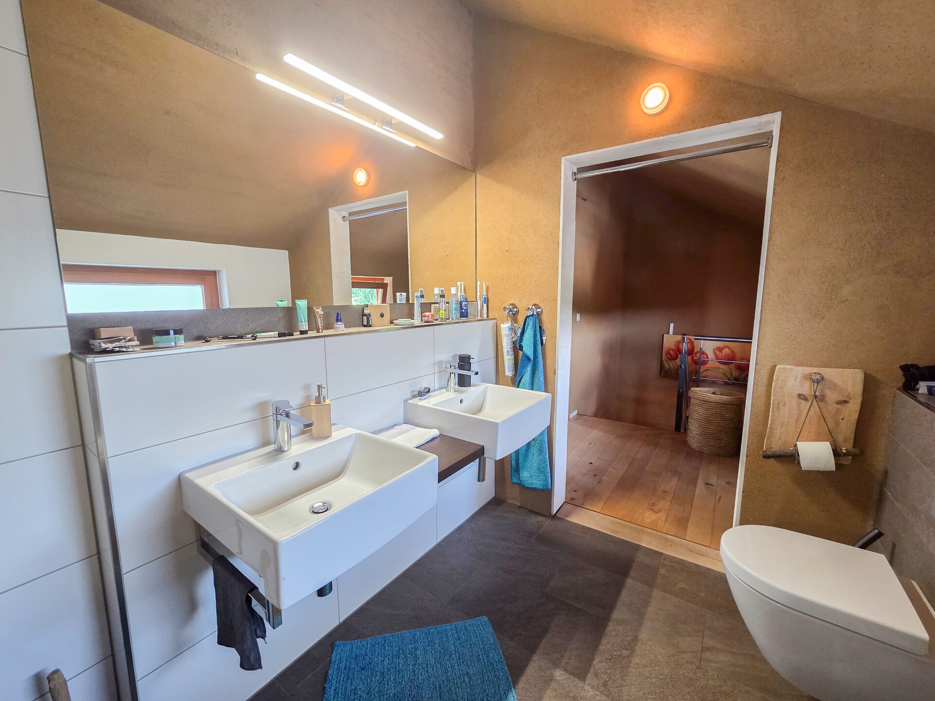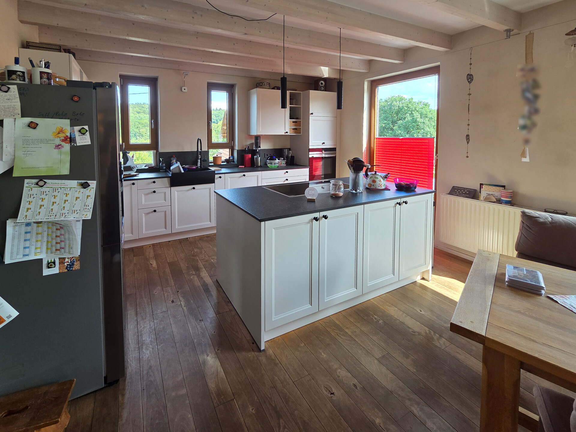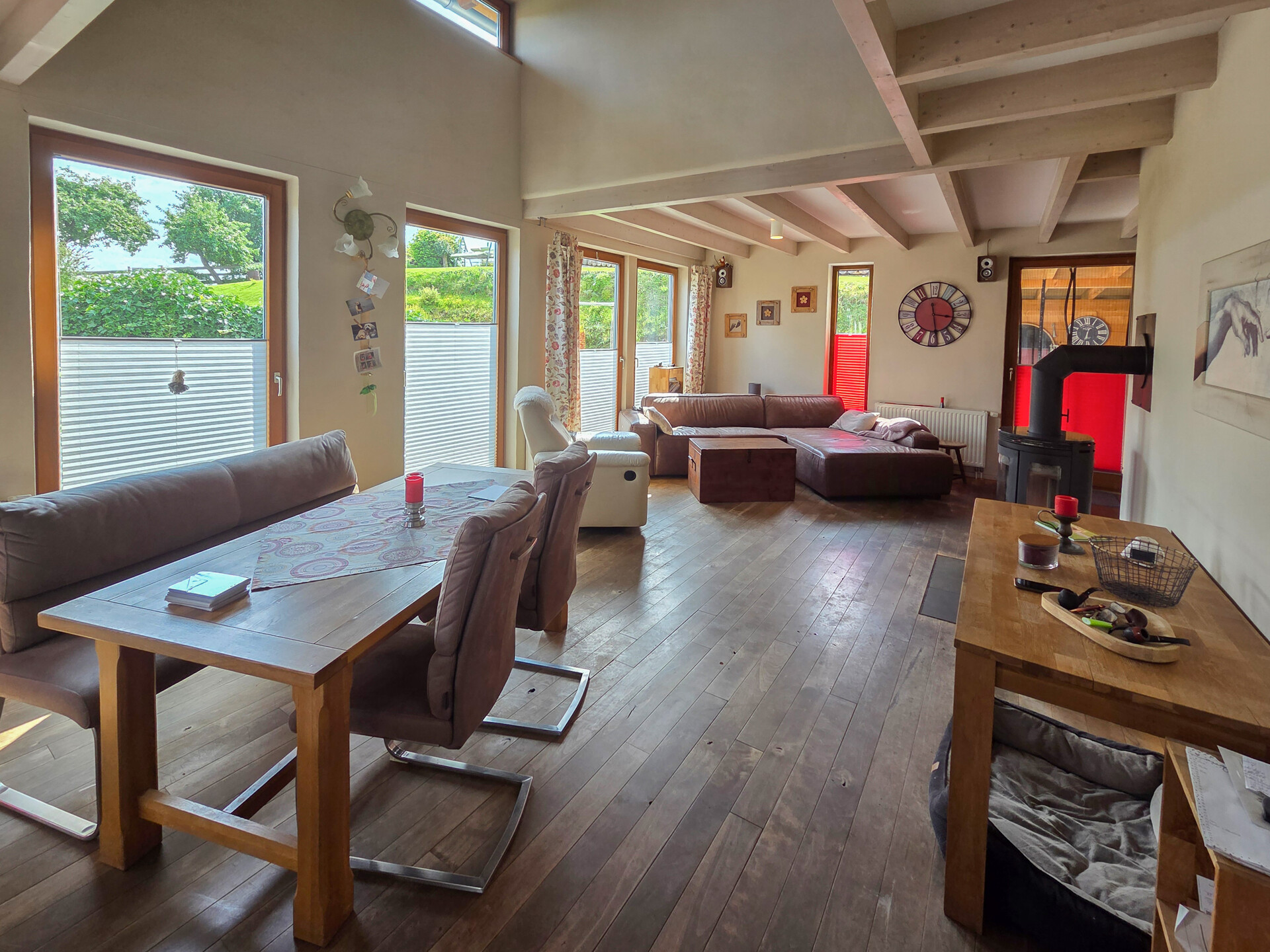 Das Haus wurde 2000 in ökologischer Holzständerbauweise errichtet, mit Holzfaserdämmplatten gedämmt und bietet ca. 177 m² Wohnfläche mit offen gestalteten Räumen, freiliegenden Balken, einer offenen Galerie und viel natürlichem Licht. Für ein gesundes Wohnklima sorgen 3 cm starker Lehm- und Marmormehlputz. Ein Kaminofen im Wohnzimmer sowie hochwertige Echtholzböden aus Buche schaffen eine warme, einladende Atmosphäre.