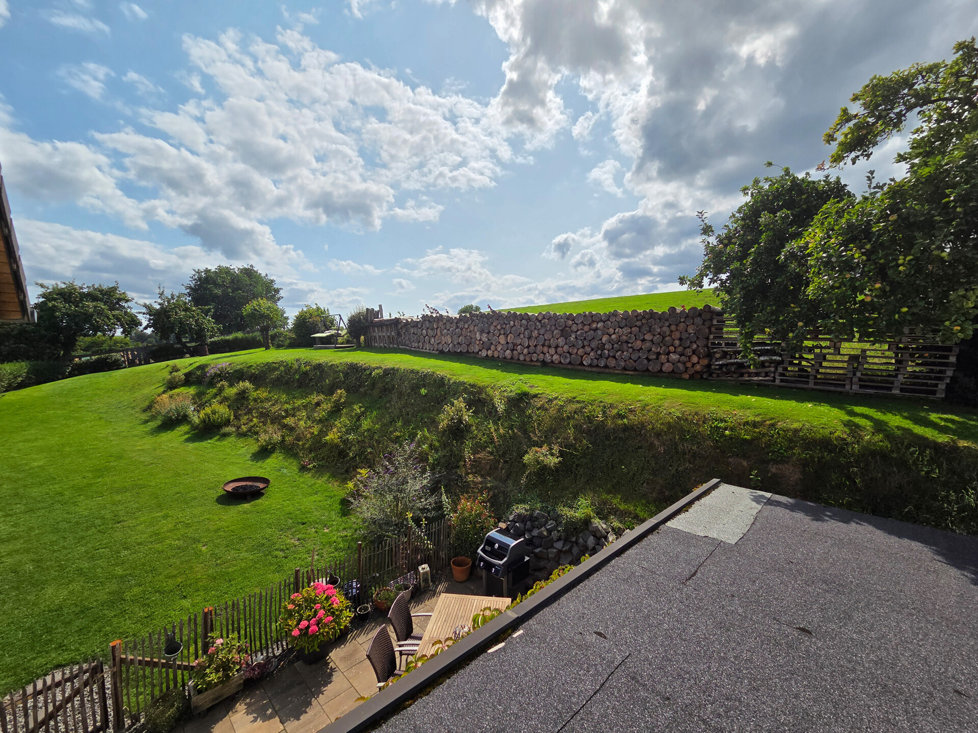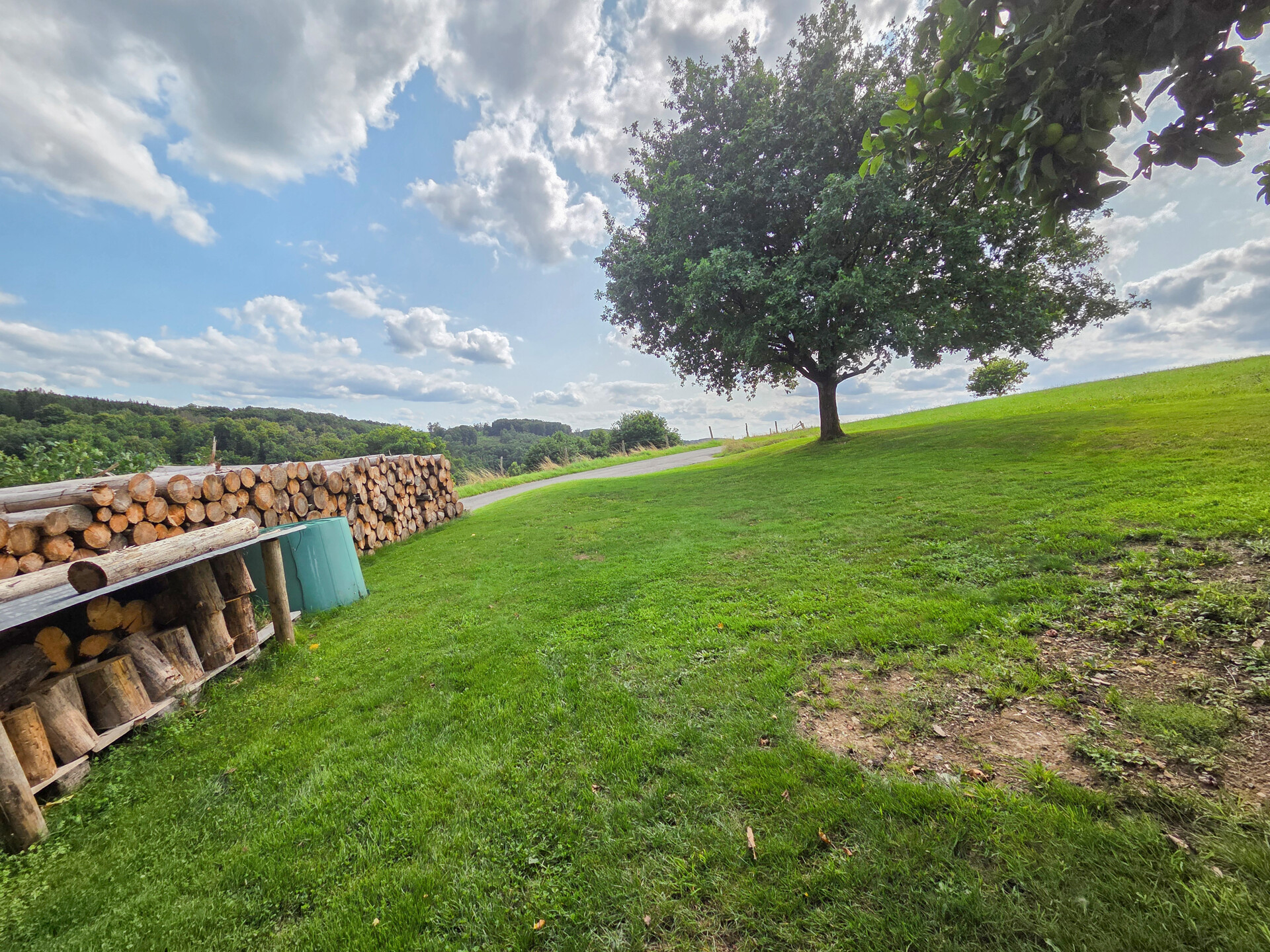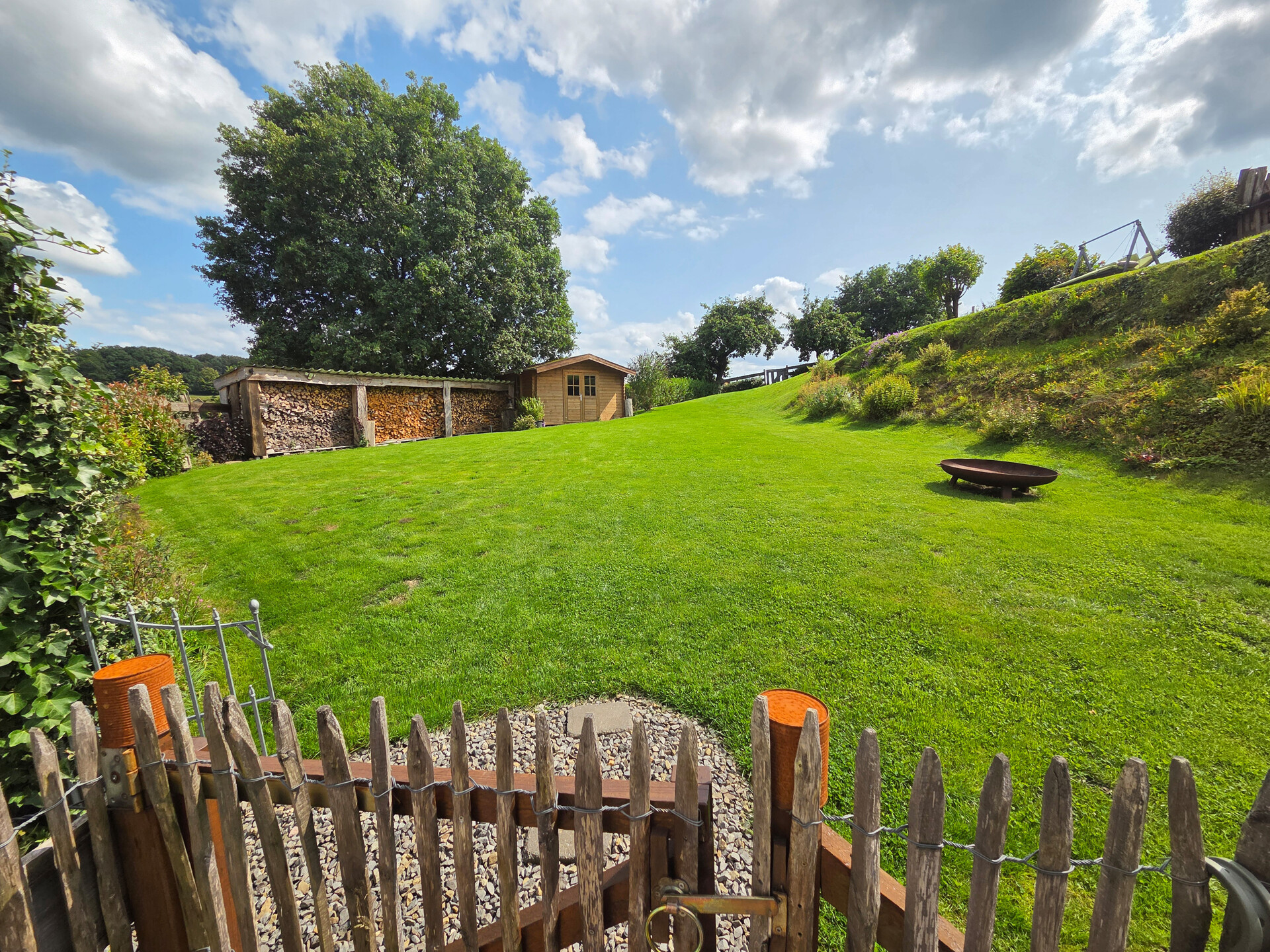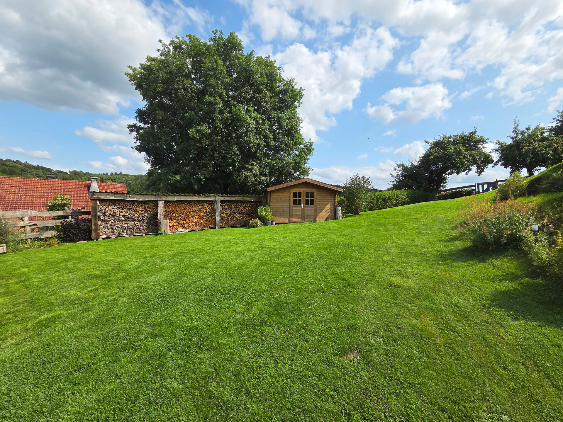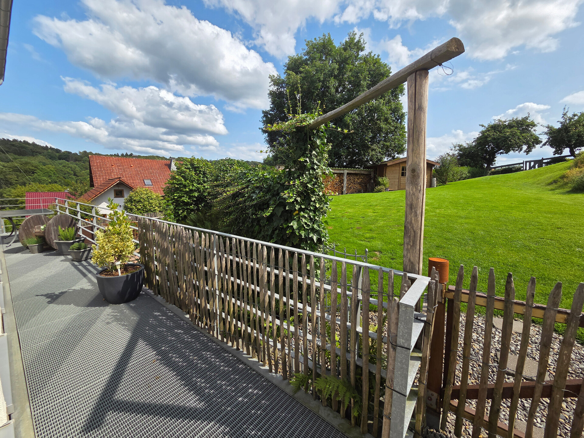 Die Highlights im Außenbereich: das weitläufige Grundstück, eine große, teils überdachte Terrasse mit herrlichem Blick ins Grüne, zwei Balkone, eine Hollywoodschaukel mit Ausblick, zwei Schuppen, ein Holzlager sowie eine 6.000 l Regenwasserzisterne. Ein Doppelcarport steht ebenfalls zur Verfügung.