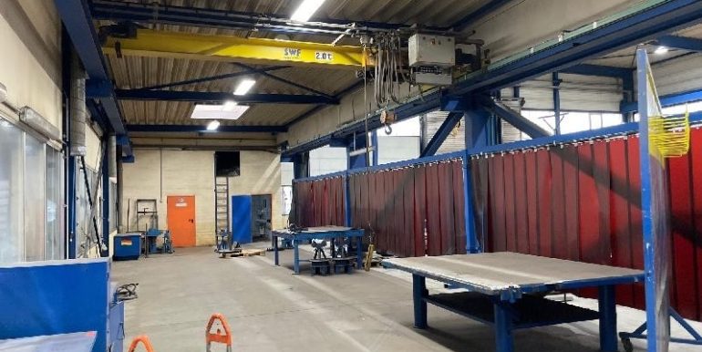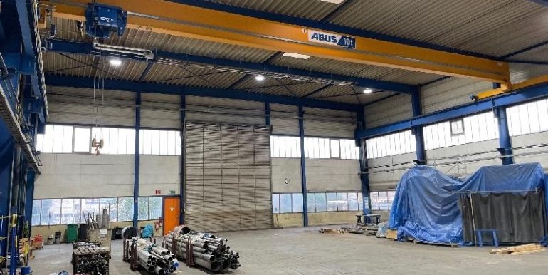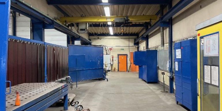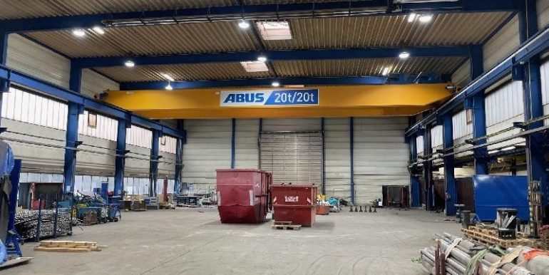 Die Andienung der Halle erfolgt über zwei ebenerdige Rolltore, das Haupttor hat die Abmessung 8 m Höhe und 6 m Breite. Die Deckenhöhe liegt bei ca. 10,50 m. Zur Fläche gehört eine WC-Anlage. Die Halle verfügt im Hauptschiff über zwei Kräne mit einer Traglast von 40 t bzw. 10 t. Die niedrigeren Seitenschiffe verfügen über zwei Kräne mit je 2 t Traglast (geeignet z.b. als Montagebereich). Die Beheizung erfolgt über energieeffiziente Gasdunkelstrahler und die Beleuchtung über Hallentiefstrahler mit LED-Technik. Einer Erweiterung um ca. 2.070 m² wäre durch die Verbindung mit der Nachbarfläche möglich.