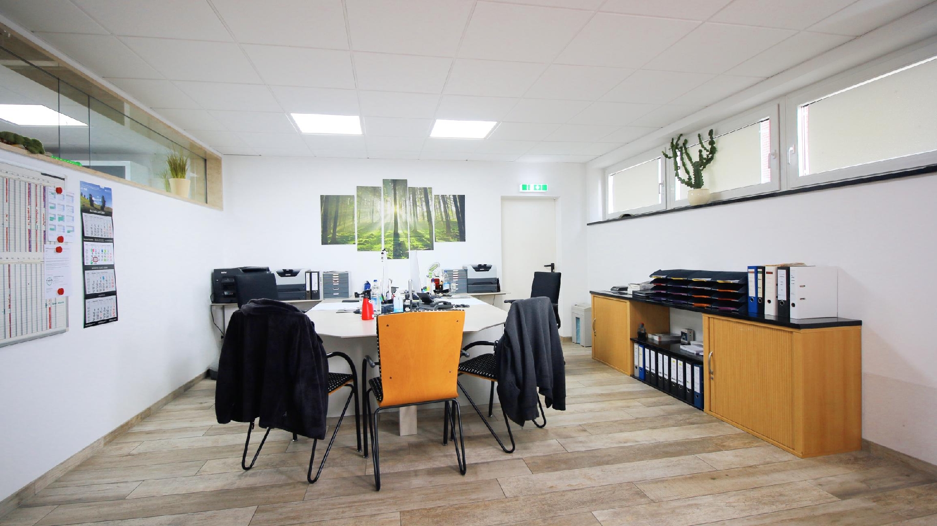 Direkt angeschlossen liegen die Büroräume für Beratung und Administration sowie die Küche als Sozialraum.