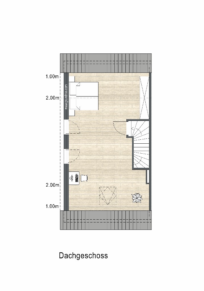 Ein Stockwerk höher, im Dachgeschoss, befindet sich ein großes Studio für die größeren Kinder oder ein Rückzugsort für die Eltern.