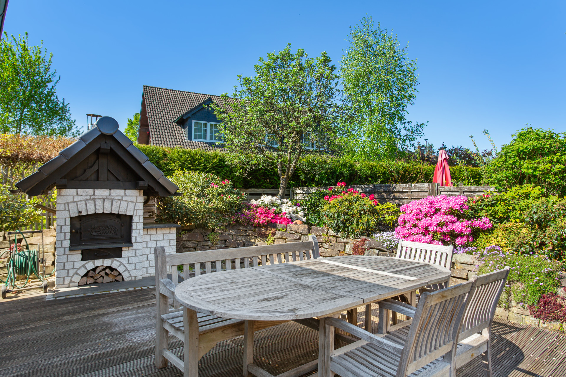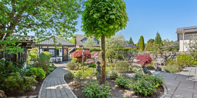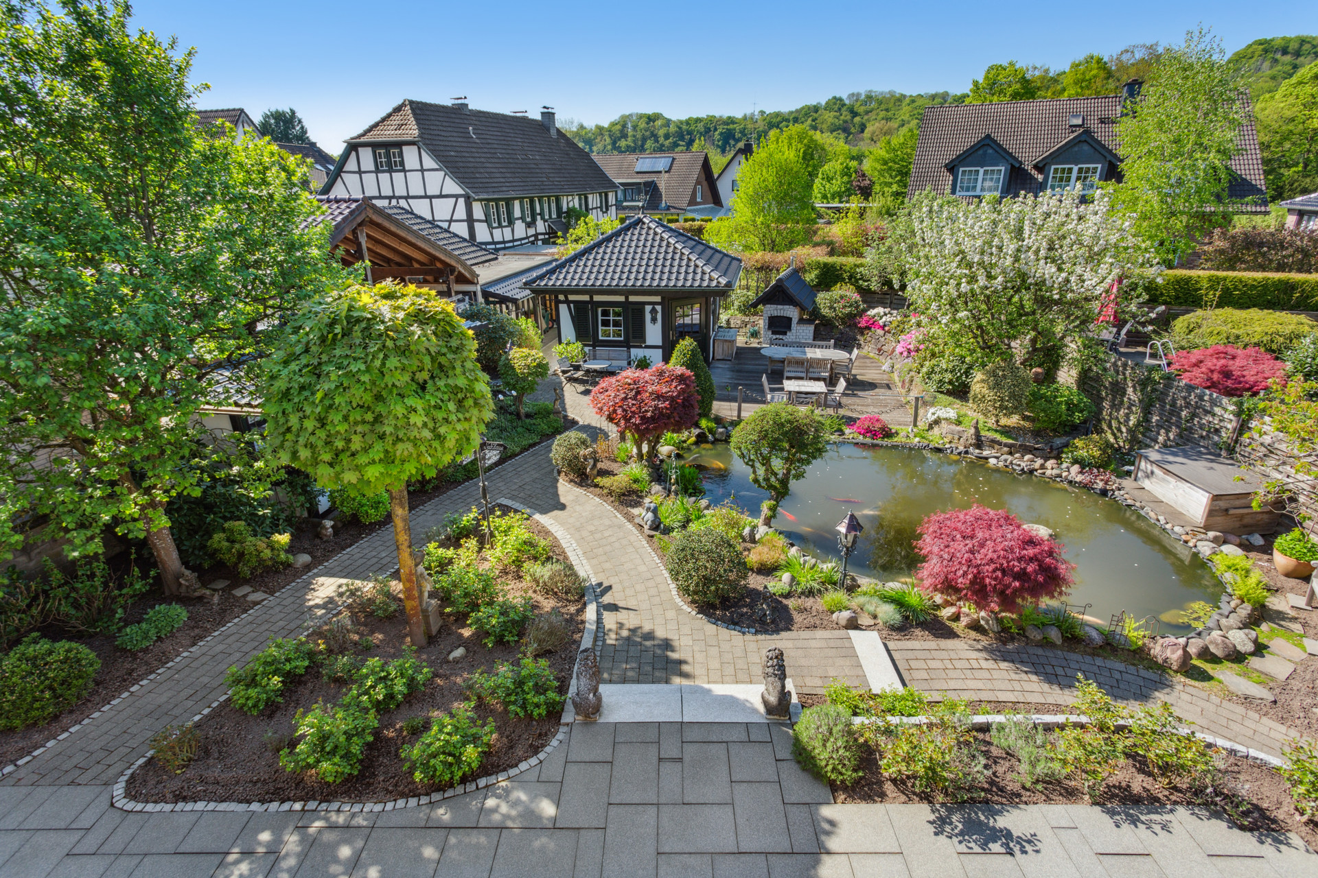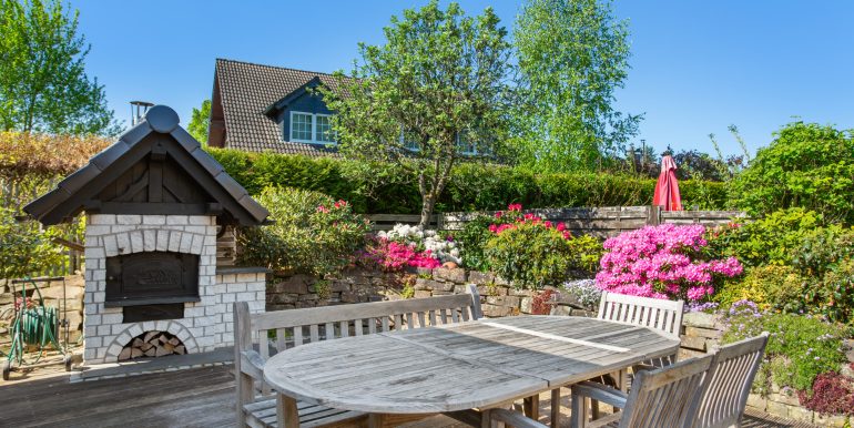 Der Außenbereich wurde mit viel Liebe gestaltet und bietet verschiedene Möglichkeiten zur Nutzung und Erholung. Ein Gartenhaus mit Kamin und eigener Terrasse eignet sich ideal für gemütliche Stunden im Freien. Abgerundet wird das Angebot durch einen Holzbackofen, der den Garten zusätzlich aufwertet. Ein idyllischer Teich mit Koi-Karpfen unterstreicht die Exklusivität dieses Anwesens.