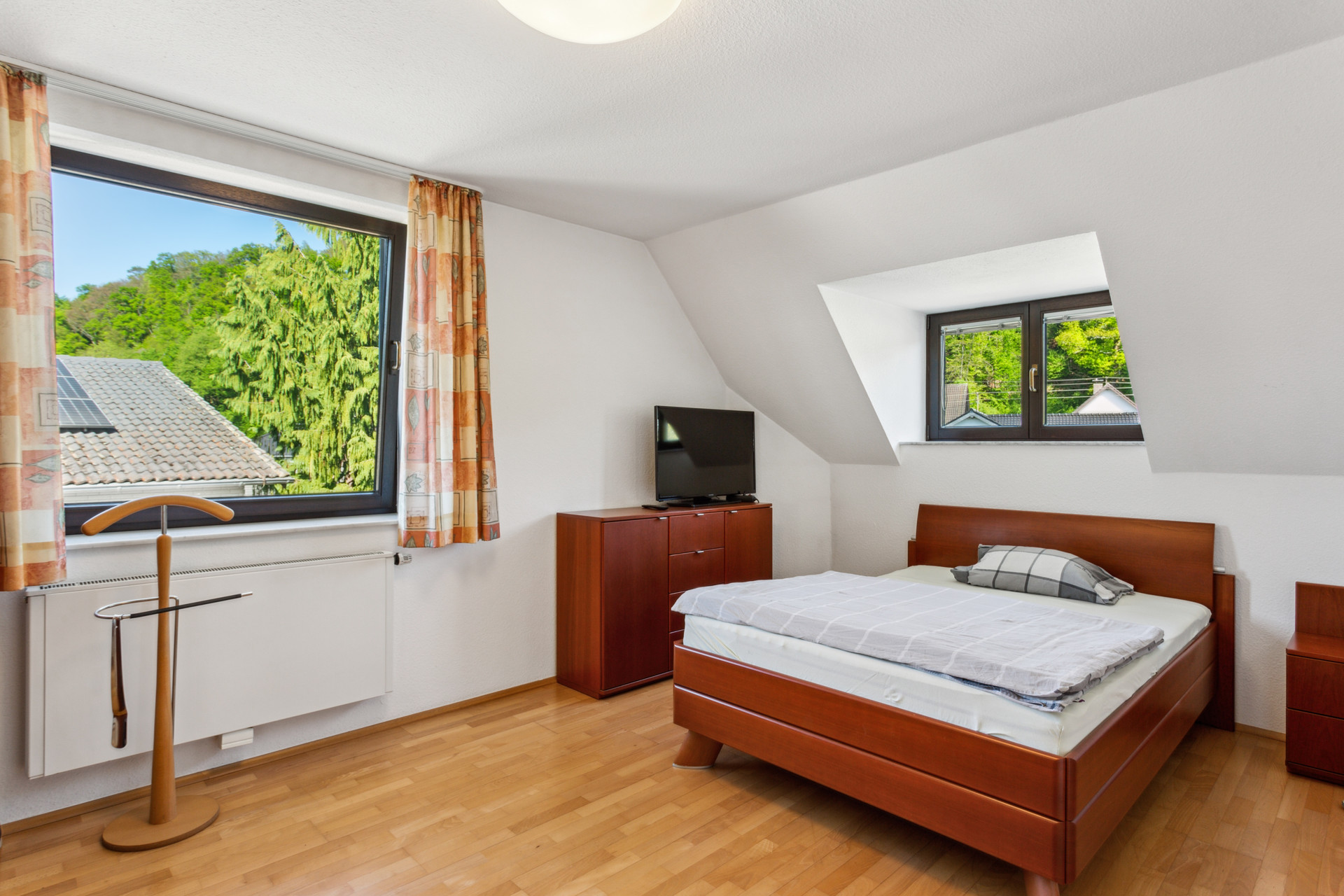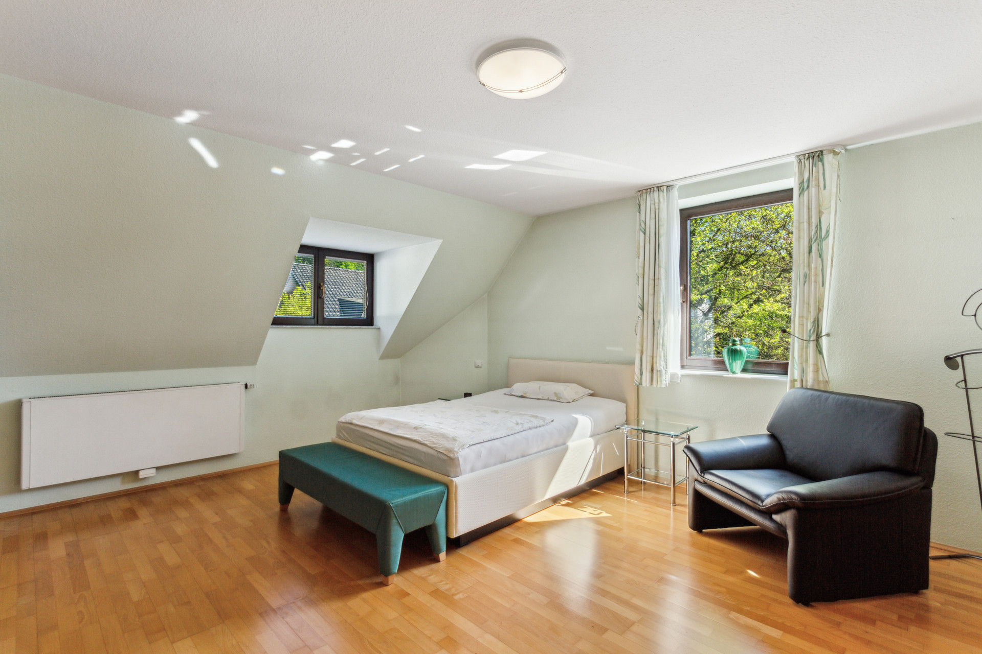 Im Obergeschoss stehen drei Schlafzimmer zur Verfügung, die jeweils über einen eigenen Zugang zu einem Badezimmer verfügen. Ein seltener Komfort, der den Wohnwert deutlich erhöht. Zusätzlich ist ein Ankleidezimmer vorhanden, das an eines der Schlafzimmer anschließt.