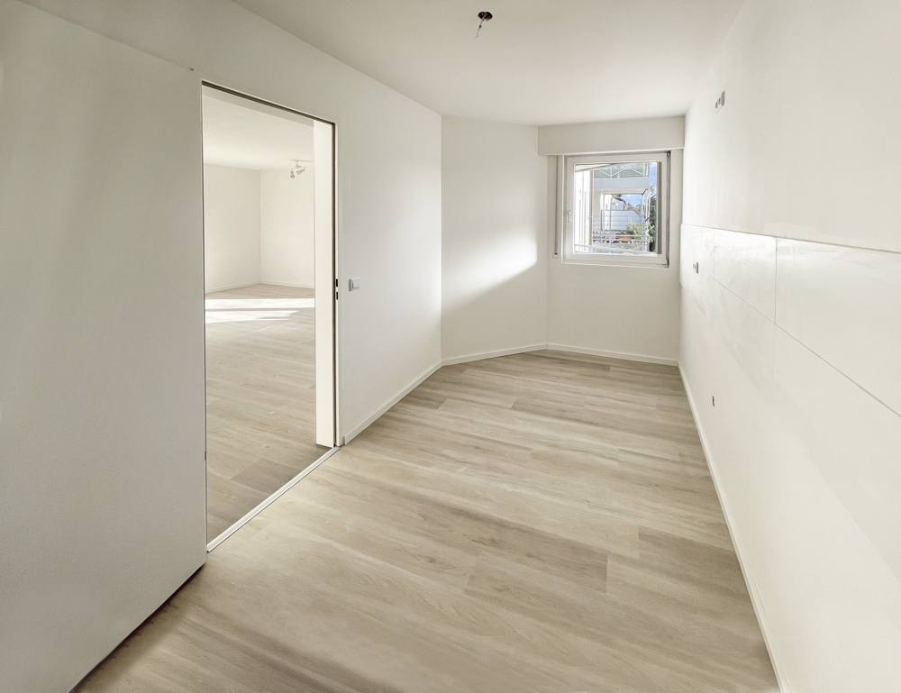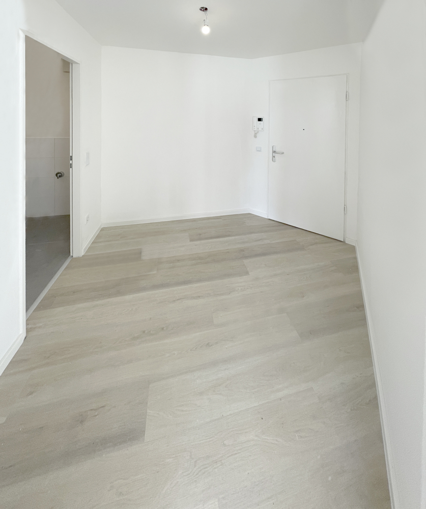 Im Rest der Wohnung wurde durchgehend ein moderner Vinylfussboder verlegt. Im Flur befindet sich ein praktischer Einbauschrank mit viel Stauraum und eine Glastür zum Wohnzimmer. Der Fliesenspiegel in der Küche ist identisch mit den hellen Wandfliesen im Badezimmer.