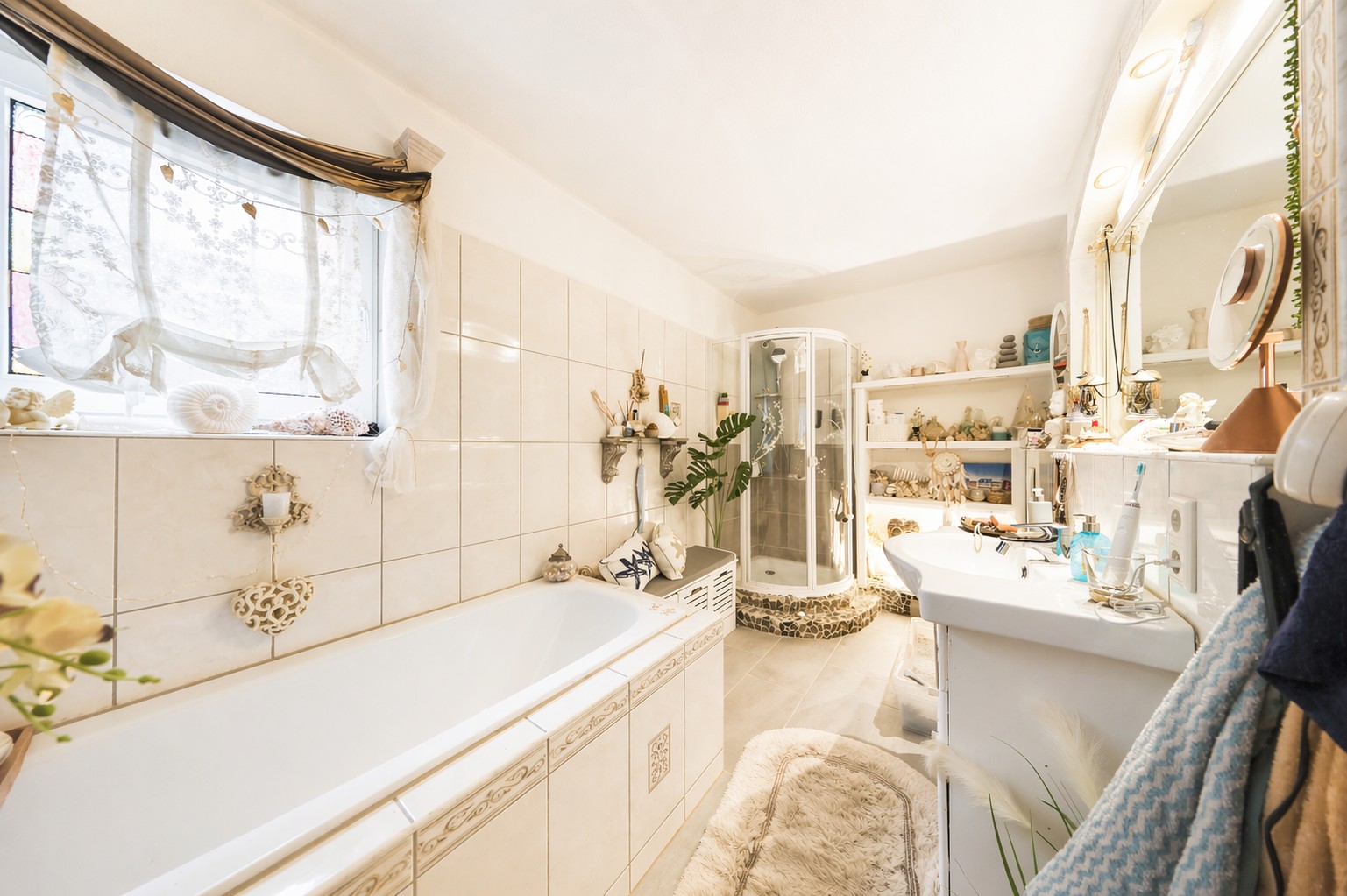 Das Badezimmer ist großzügig bemessen, funktional ausgestattet und verfügt über eine Badewanne sowie eine separate Dusche.