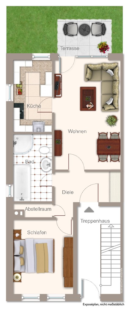 Die teilüberdachte Terrasse bietet Schutz vor Witterungseinflüssen und erweitert den Wohnraum ins Freie. Der zugehörige Gartenanteil ist großzügig bemessen und nach Süd-Osten ausgerichtet.