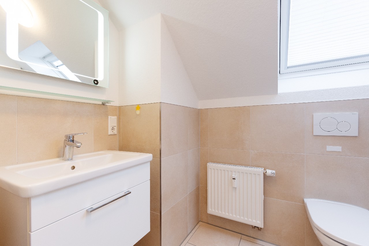 Die beiden hellen beheizbaren Räume, die sich hervorragend für Ihre Hobbys bzw. Unterbringung Ihrer Gäste eignen, werden Sie auch begeistern. Ein großes WC mit Handwaschbecken und Fenster ist hier ebenfalls vorhanden. Die Böden bestehen auch hier aus großformatigen hellen Fliesen. Dieser Bereich stellt keine offizielle Wohnfläche im klassischen Sinne dar. Dennoch ist der Ausbau sehr gelungen und schafft eine wohnliche Atmosphäre, die an die Wohnung im Erdgeschoss heranreicht.