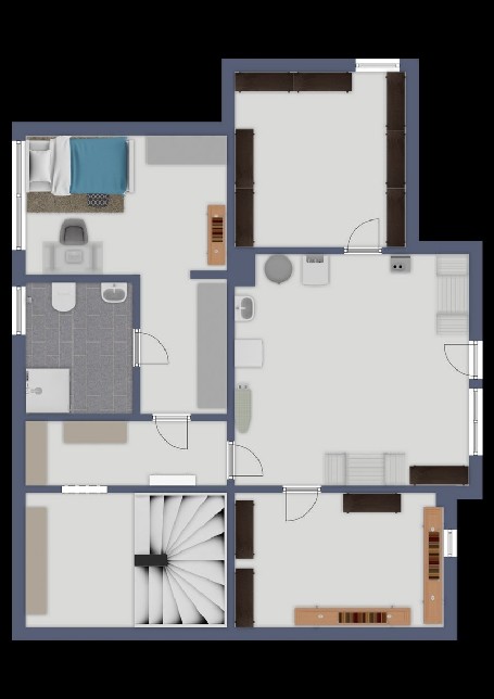 Vom Obergeschoss führt eine Wendeltreppe in das Dachgeschoss. Dieses präsentiert sich besonders hell und offen gestaltet und verfügt über zwei separate Zimmer, ein großes Badezimmer mit Badewanne sowie einen großzügigen, offenen Treffpunkt in der Mitte. Durch die Dachflächenfenster entsteht hier eine sehr angenehme Wohnatmosphäre. Dieser Bereich eignet sich ideal als Spielbereich für Kinder, Homeoffice, Atelier oder zusätzlicher Wohnbereich.