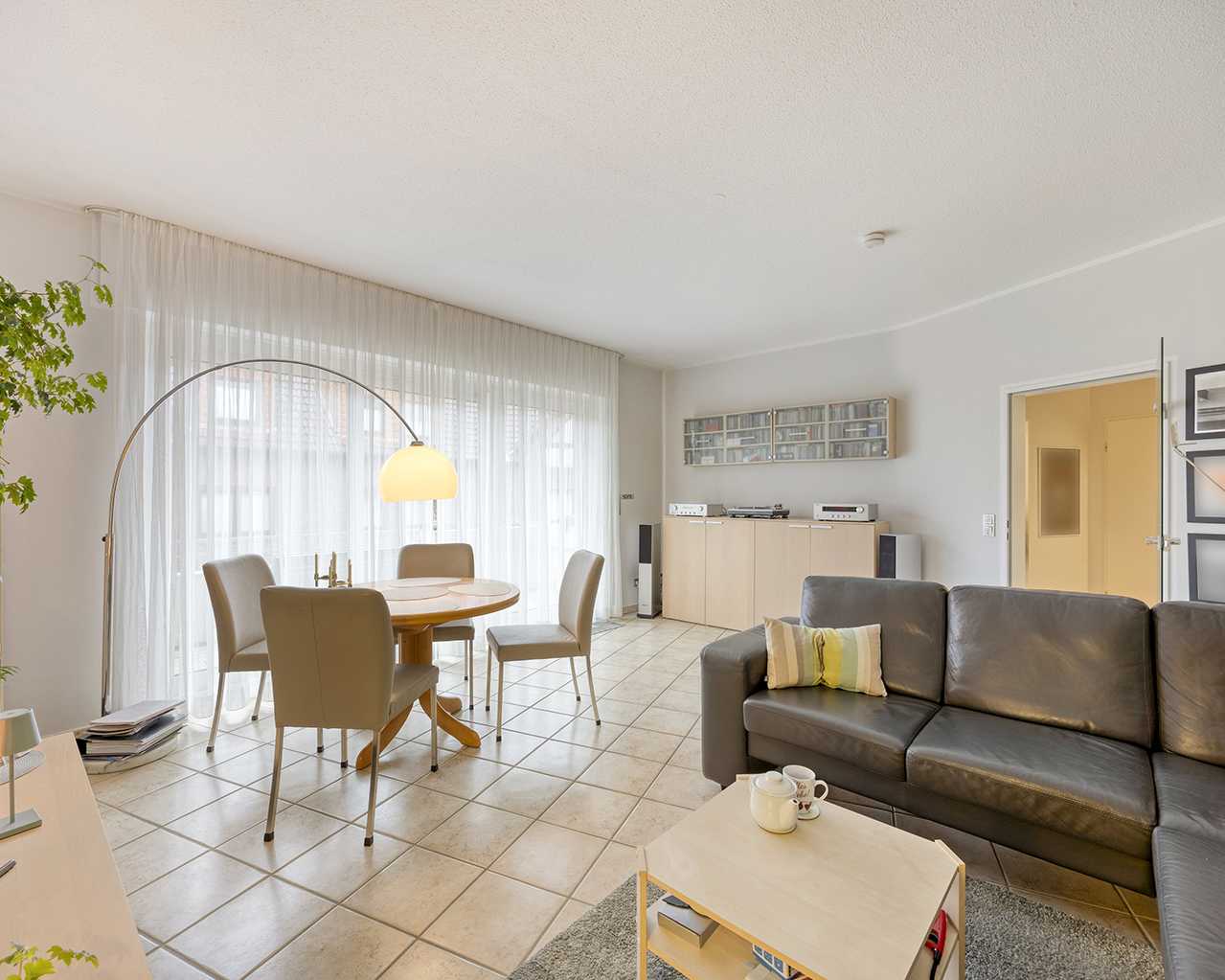 Von der zentralen Empfangsdiele aus gelangen Sie in das helle und gut geschnittene Wohnzimmer mit angrenzendem Balkon, die geräumige Küche und das Gäste-WC.