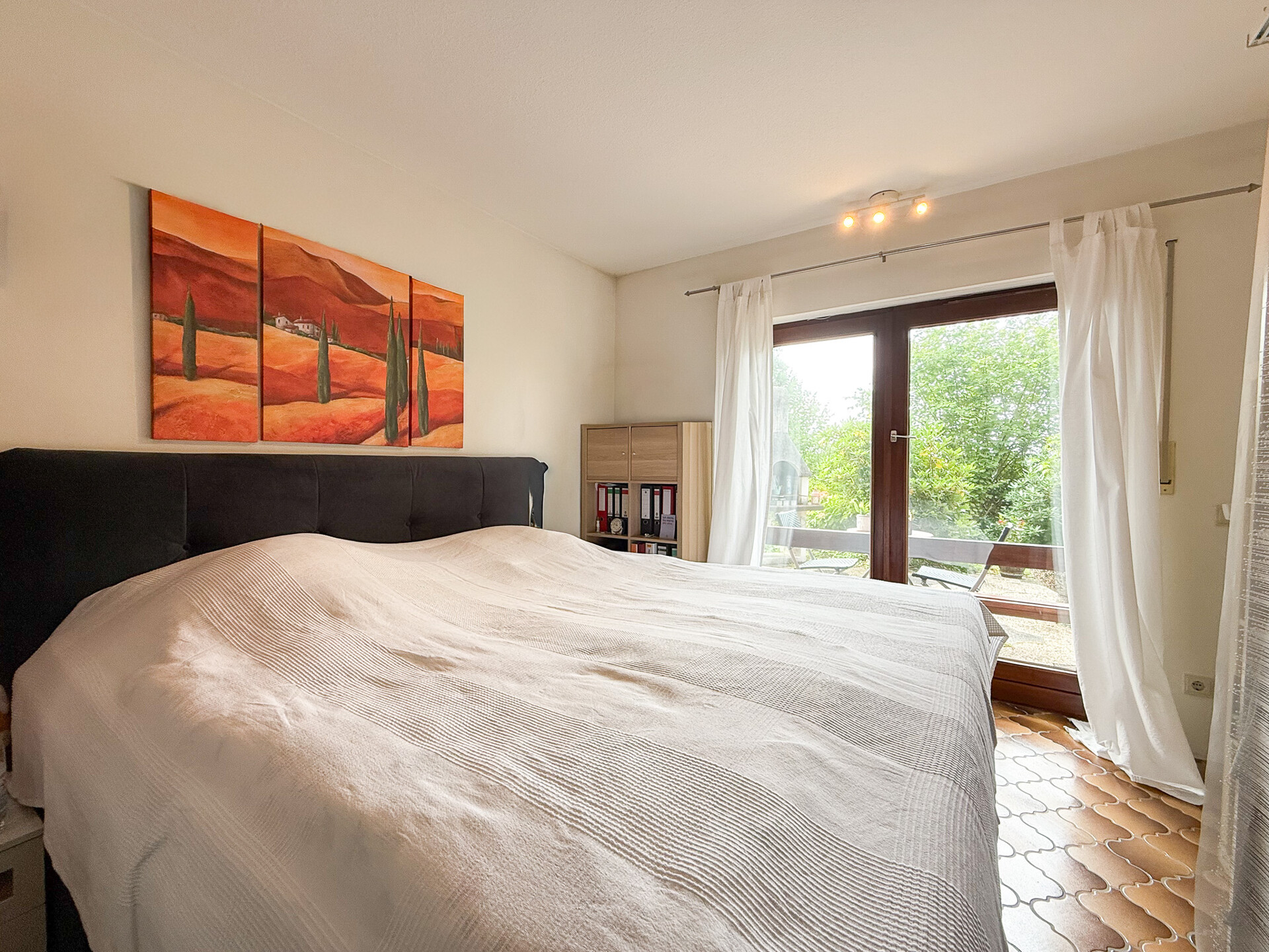Vom Wohnzimmer aus besteht auch der Zugang zum Balkon, der zum Verweilen und Genießen einlädt. Dieser ist mit einer Markise ausgestattet. Das Schlafzimmer liegt gleich nebenan und bietet ebenfalls einen direkten Balkonzugang. Angrenzend befindet sich ein Badezimmer mit Badewanne und Dusche, das durch ein Tageslichtfenster zusätzlichen Komfort bietet. Ein separates Gäste-WC gleich im Eingangsbereich rundet das Raumangebot dieser Ebene ab. Auch dieses ist mit einem Tageslichtfenster ausgestattet.