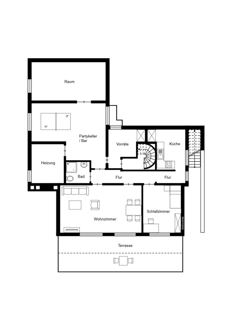 Ein separater Teil des Gartengeschosses verfügt über einen großzügigen Raum, welcher aktuell als Partykeller genutzt wird. Dieser bietet viel Platz für Abstellmöglichkeiten, Fitness oder kreative Projekte. Er steht beiden Mietparteien zur Verfügung. Die Erdgeschosswohnung gelangt direkt über eine Wendeltreppe im Eingangsbereich in den Kellerbereich des Gartengeschosses und auch zu den zum Erdgeschoss gehörigen Räumen wie dem Vorratsraum.