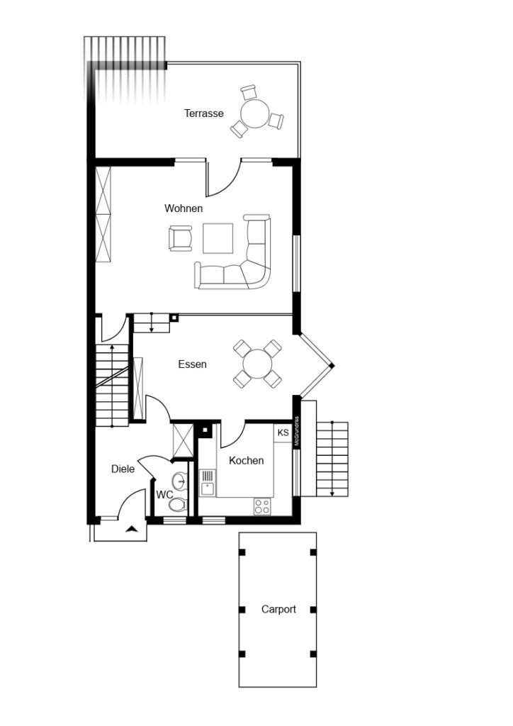 Diese Immobilie bietet eine tolle Raumaufteilung mit Wohnkomfort durch Blick ins Grüne. Schon beim Betreten des Wohnbereichs, welcher über einen großzügigen Flur erreichbar ist, wird man durch bodentiefe Fenster und die angrenzende Terrasse von diesem Blick überzeugt.