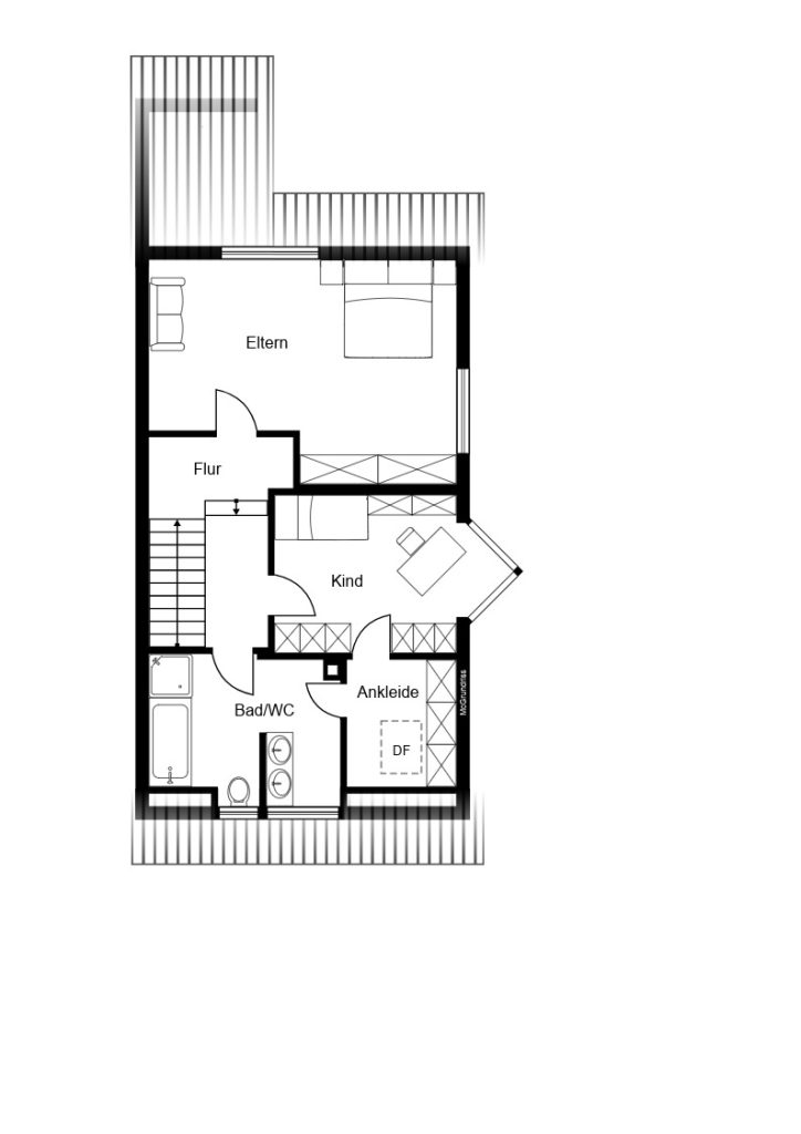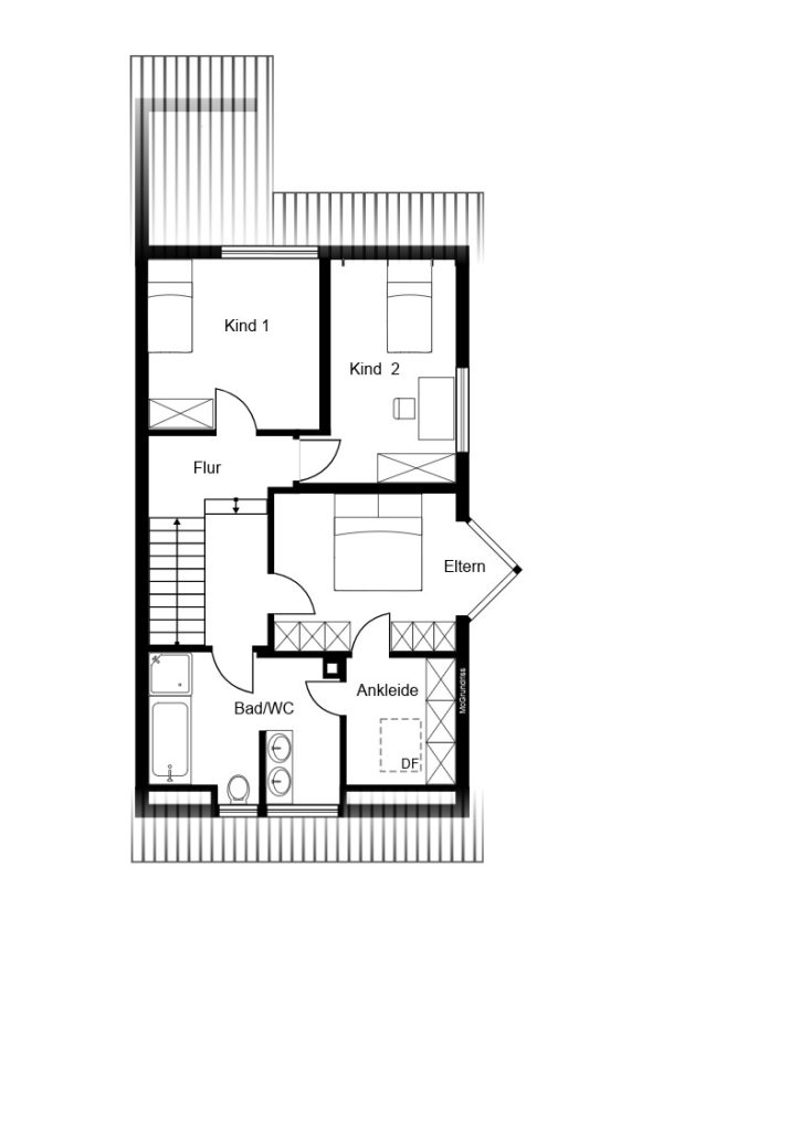 Im Dachgeschoss verbindet ein Flur alle weiteren Räume. Dazu zählt auch das große Badezimmer, welches sowohl eine Dusche und eine Badewanne bietet. Dieses Badezimmer, und auch das Gäste-WC im Erdgeschoss, sind mit Tageslichtfernstern ausgestattet. Die anderen Räume können beispielsweise als Kinder- und Schlafzimmer genutzt werden. Auf dieser Etage ist außerdem Teppichboden verlegt.