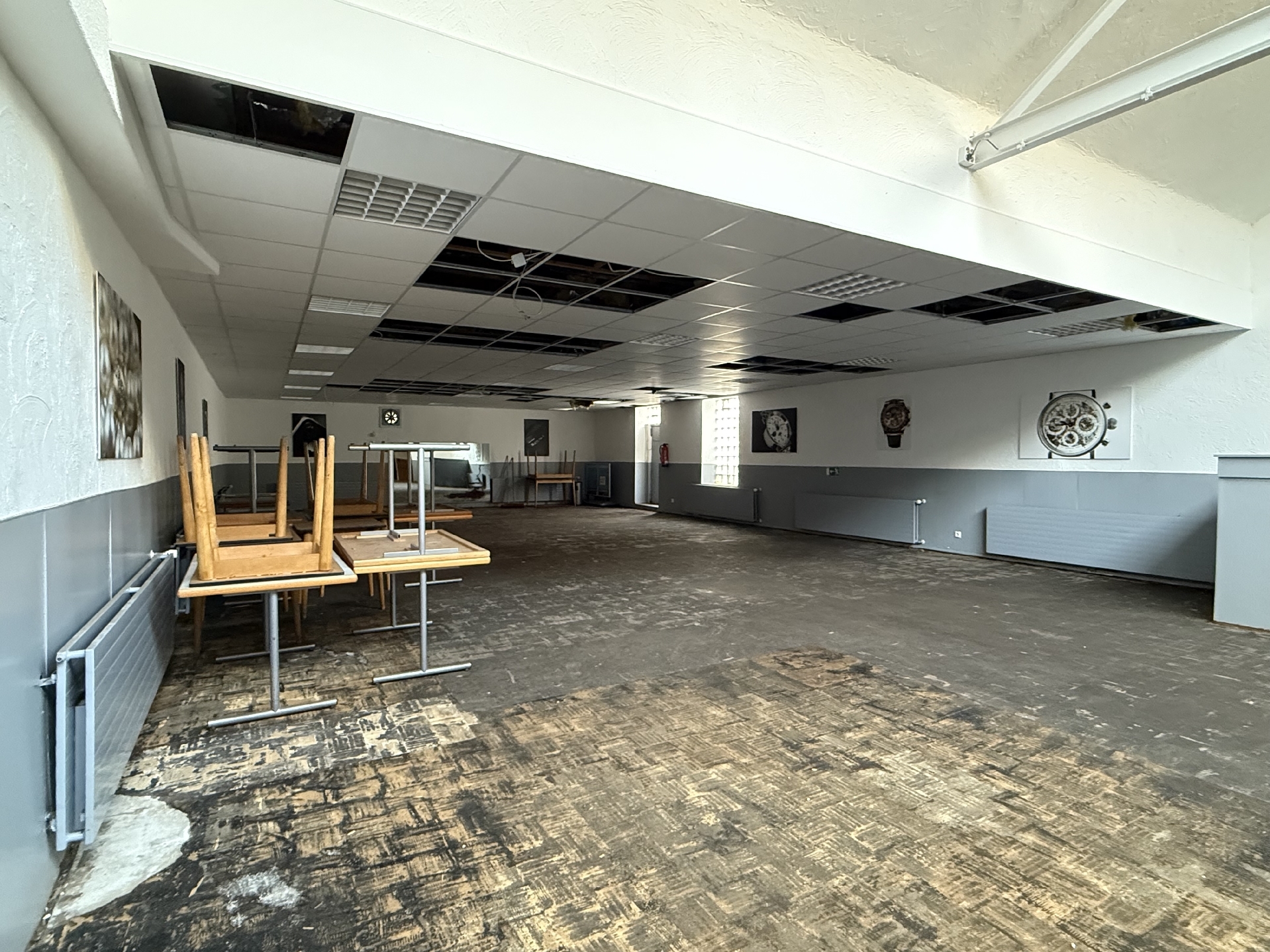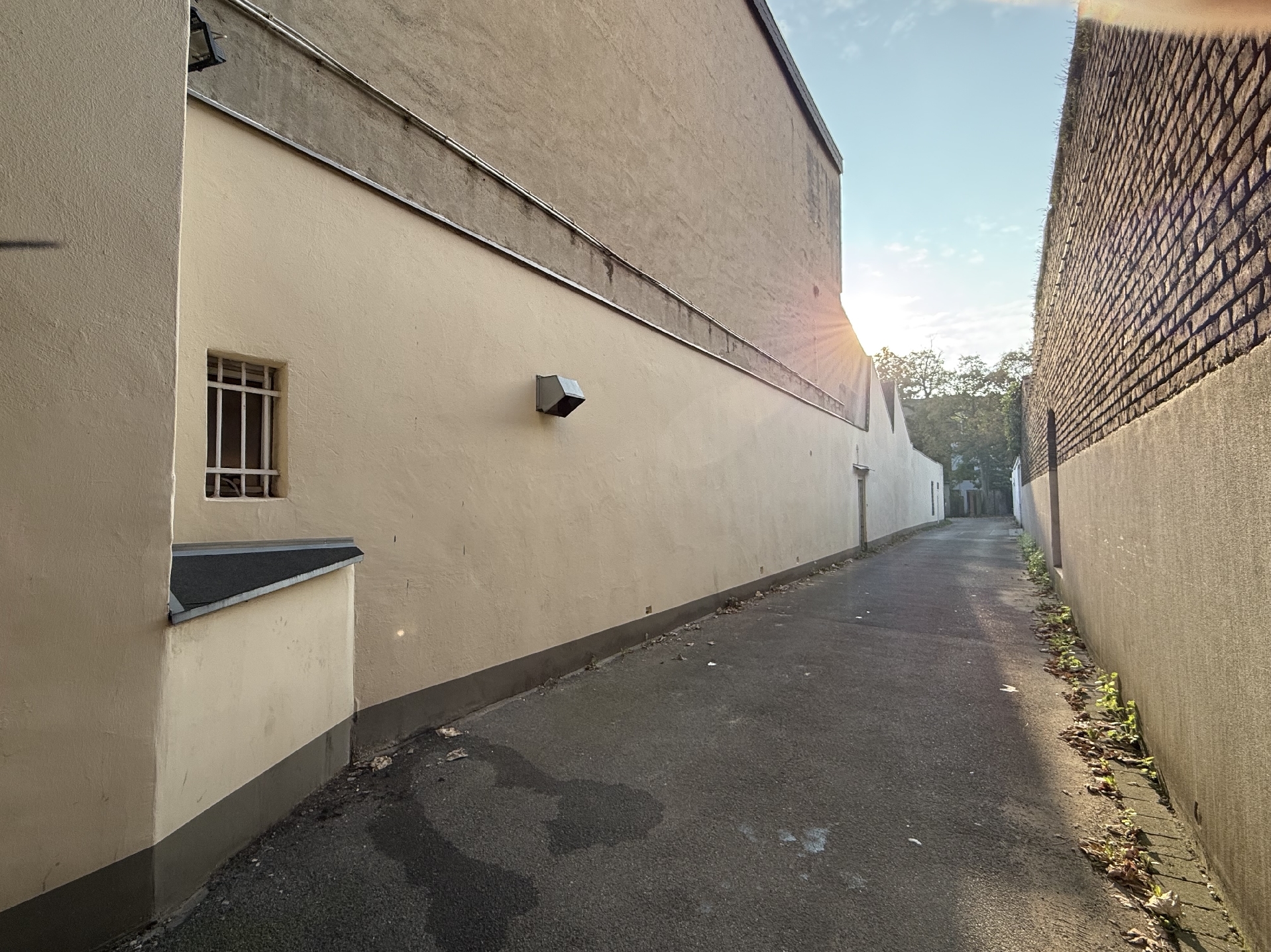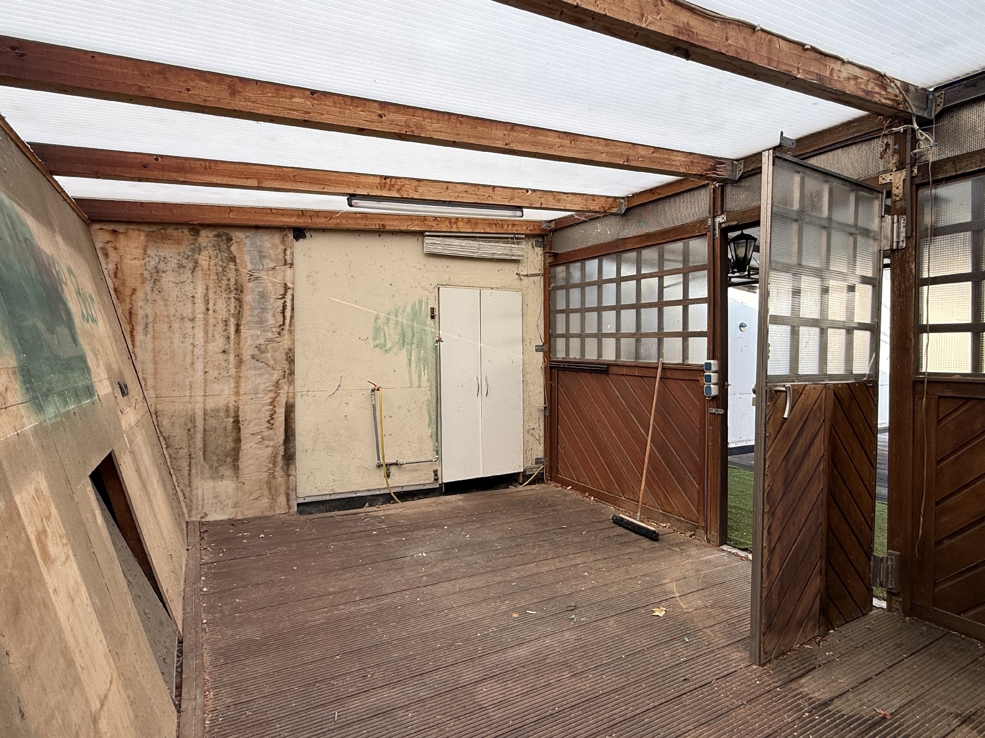 Hinter dem Haupthaus ergänzt eine ca. 171 m² große Halle das Angebot. Diese verfügt über getrennte Sanitäranlagen für Damen und Herren sowie einen weiteren Lagerraum. Der Zugang zur Halle erfolgt sowohl über das Grundstück selbst als auch über eine seitliche Einfahrt des Nachbargrundstücks.