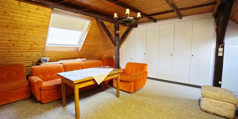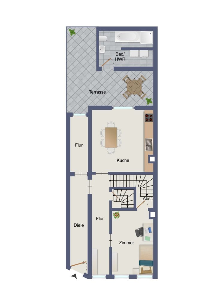 Das Haus erstreckt sich über 2,5 Geschosse. Im Erdgeschoss gelangen Sie vom Flur in zwei Zimmer, die durch einen Abstellraum mit Waschbecken verbunden sind. Praktisch ist hier die zweite Diele, die es möglich macht, z.B. mit Fahrrädern vom Garten auf die Straße zu gelangen, ohne den Wohnbereich zu beschmutzen. Über die geschlossene Holztreppe gelangen Sie ins Obergeschoss. Hier finden Sie zwei Zimmer, die Küche und das kleine Bad mit Dusche. Der ausgebaute Spitzboden bietet zusätzlich Platz als Kinder-, Schlaf-/oder Hobbybereich. Von hier erhalten Sie einen Blick auf den malerischen Dom.