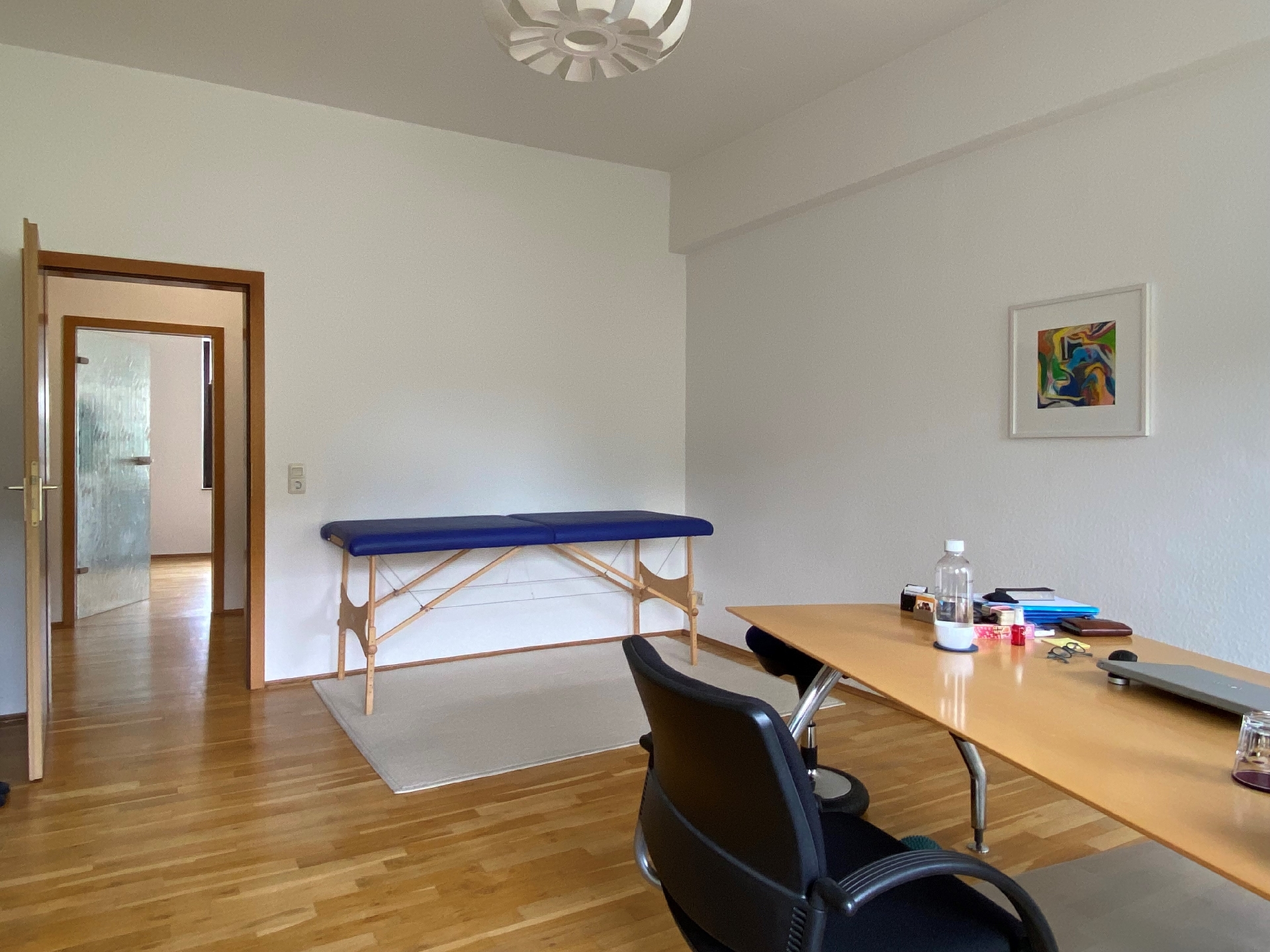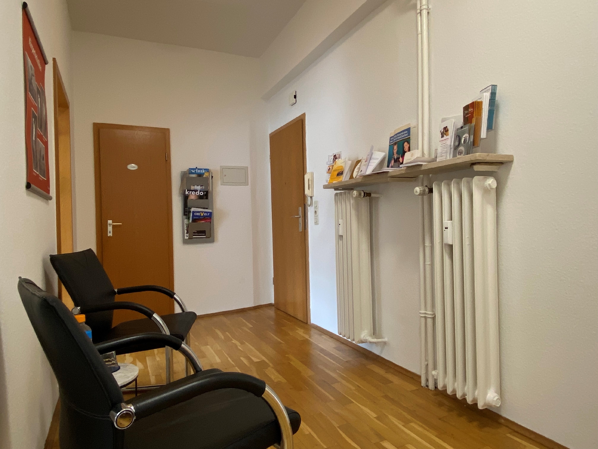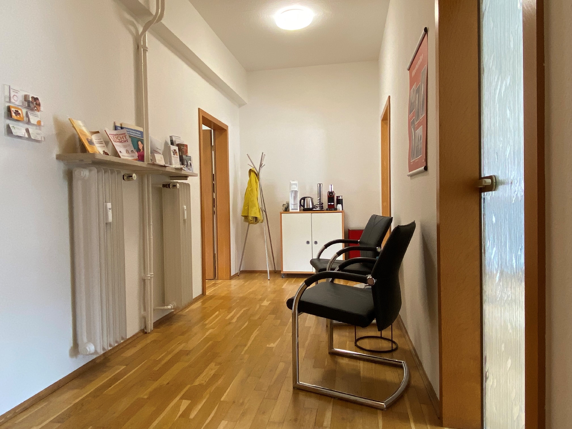 Auf etwa 57 m² verteilen sich zwei große Arbeitsräume mit einem dazwischenliegenden Flur, welcher derzeit auch als Garderobe und Wartebereich genutzt wird, sowie einem hellen Sanitärbereich und einem kleinen Austritt zur Rückseite des Hauses.